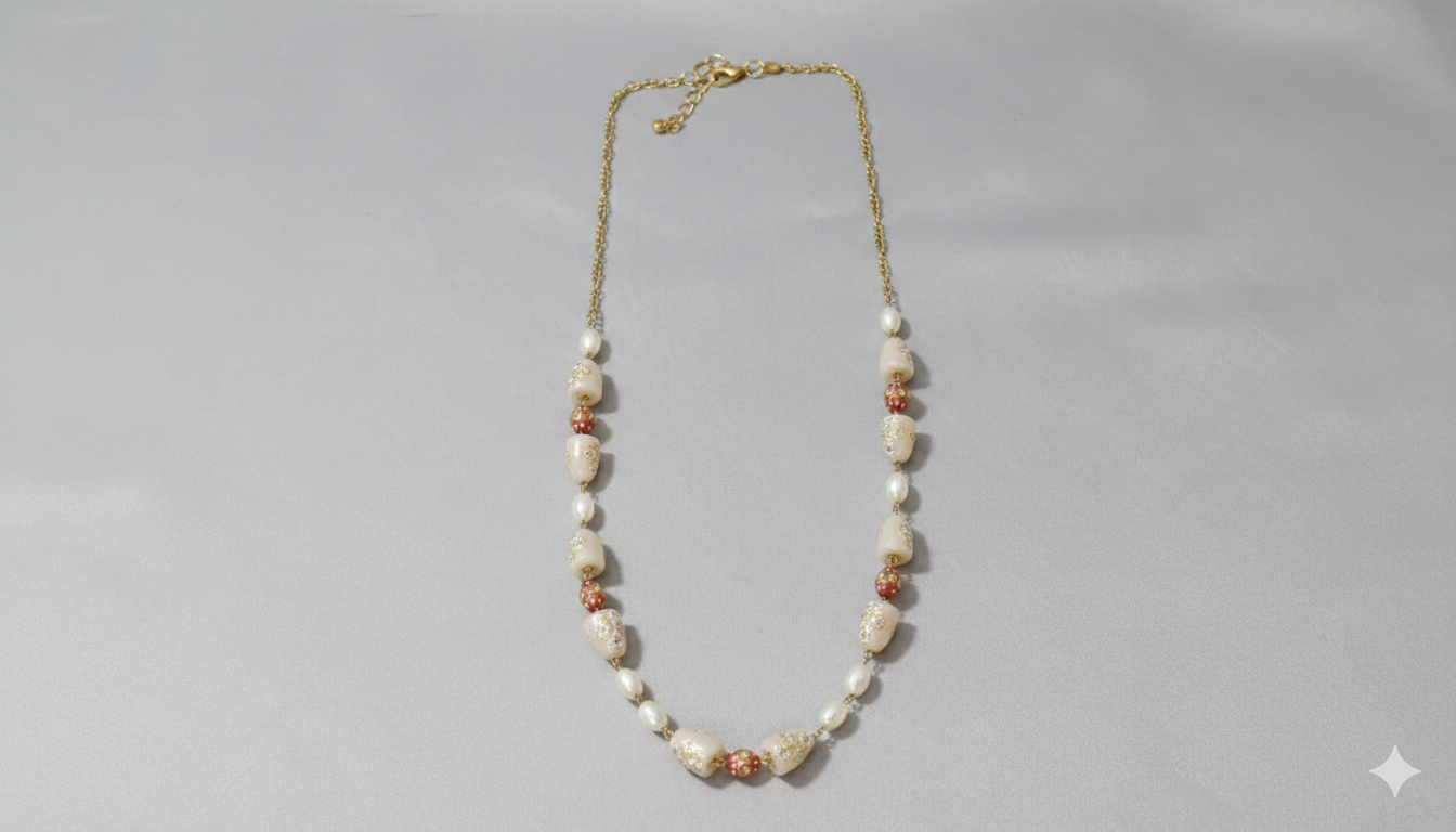 The making of this necklace begins with the careful selection of materials. Artisans choose smooth off-white pearls, acrylic thimbles, and fine glass beads that complement one another in size and tone. A delicate gold-finish chain forms the base, onto which each element is attached by hand. The process demands patience—balancing the placement of pearls, beads, and color accents so the necklace feels harmonious rather than heavy. Every joint is checked for strength, ensuring durability while maintaining a lightweight feel. Because it is handcrafted, no two pieces are exactly alike, giving each necklace its own quiet character.