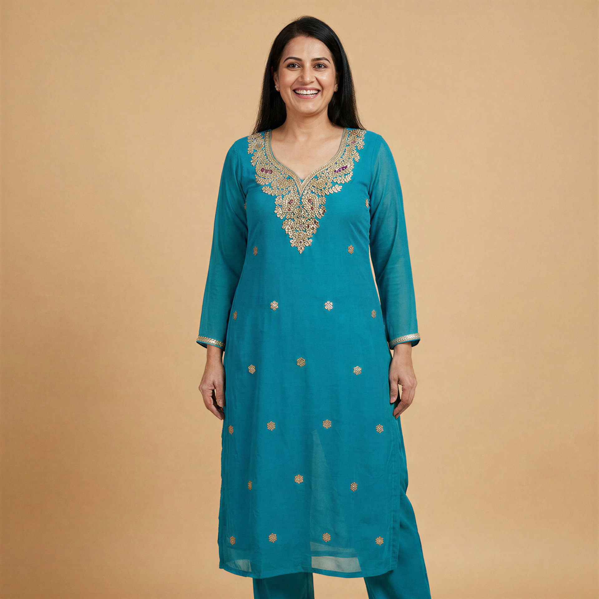 - Embellishment: Handcrafted Gotta Patti work with a fully embroidered neck yoke and scattered body booties