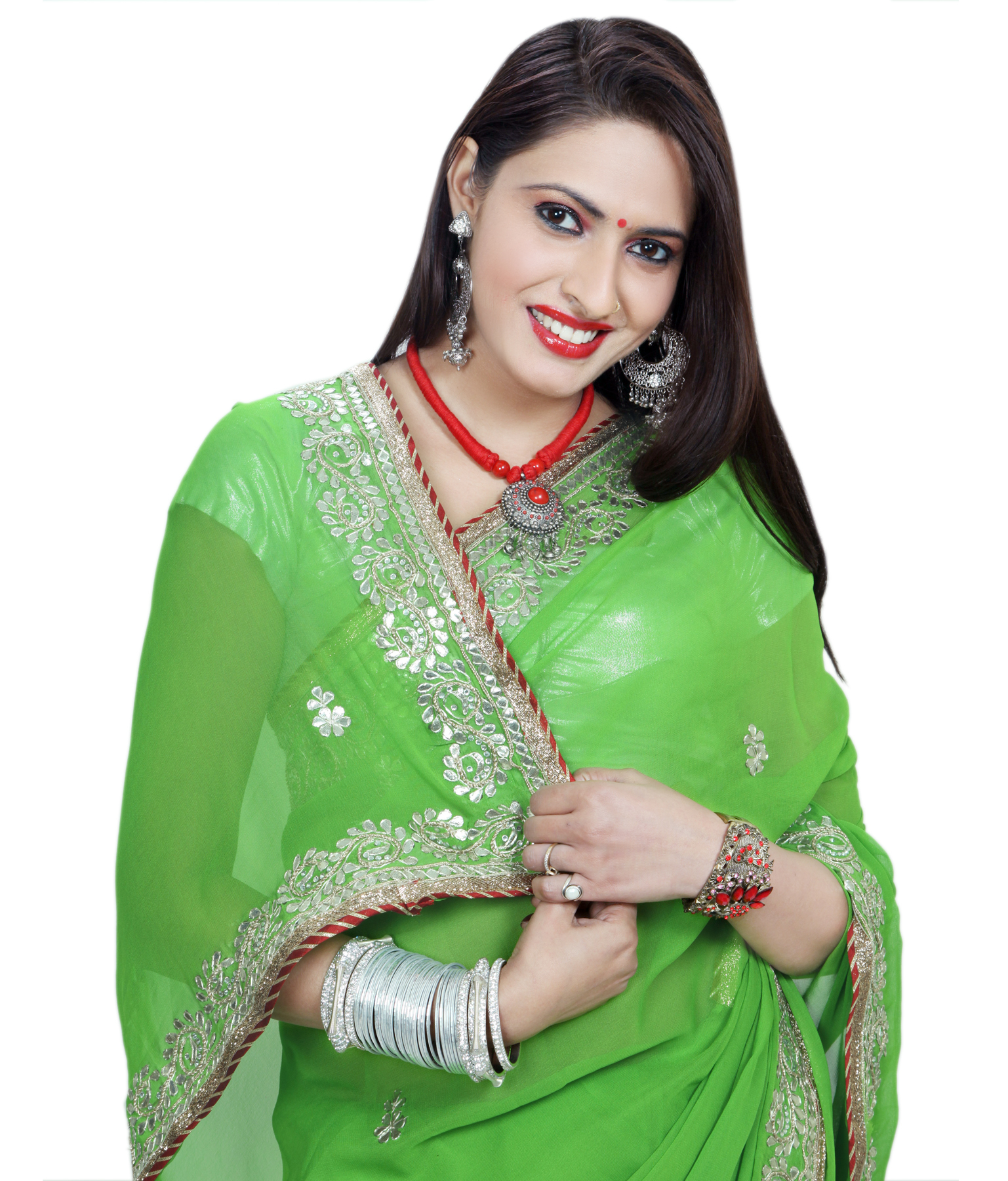 The contrast between the luminous green georgette and the gleaming silver gotta creates a visual symphony that's both eye-catching and refined. Scattered gotta motifs across the body of the saree add subtle sparkle, whilst the heavily embellished border commands attention without overwhelming the senses.