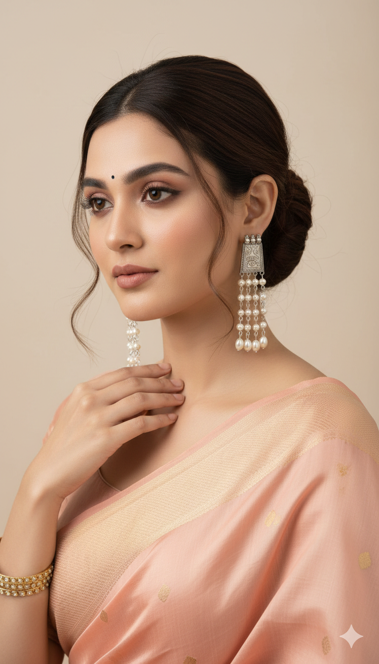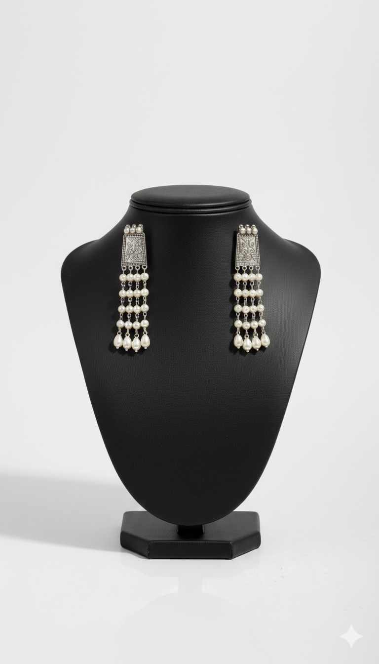 Silver-plating and oxidisation are specialised jewellery-making techniques that require considerable expertise and artistic sensibility. Delhi's artisans have mastered these processes over generations, creating pieces that carry an authentic vintage character. The creation of these earrings begins with shaping the silver-plated geometric stud, which is then carefully engraved with traditional motifs using fine chiselling tools. The oxidisation process is applied deliberately, darkening the metal to create an antique finish that highlights the carved detailing beautifully. Each groove and pattern becomes more defined against the darkened background, adding depth and dimension to the metalwork. The pearl arrangement requires particular precision, as four to five individual strands must be created and attached at evenly spaced intervals to achieve the dense, layered effect. Each strand is carefully assembled by threading individual round pearls and finishing with a graceful teardrop pearl at the bottom. This teardrop finishing creates elegant movement when worn, catching light and swaying gently with every step. The artisan must ensure each strand hangs at precisely the correct length to create the cascading waterfall effect that defines the earrings' visual impact.