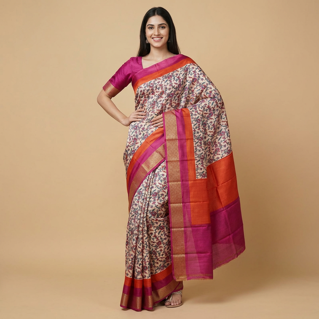 This saree is crafted from pure Tussar silk, known for its natural sheen and soft feel. Each piece is meticulously handcrafted with unique handblock prints and vibrant handpainted patterns, reflecting the rich cultural heritage of West Bengal. The saree comes with a tailored blouse that perfectly complements its design, enhancing its charm.
