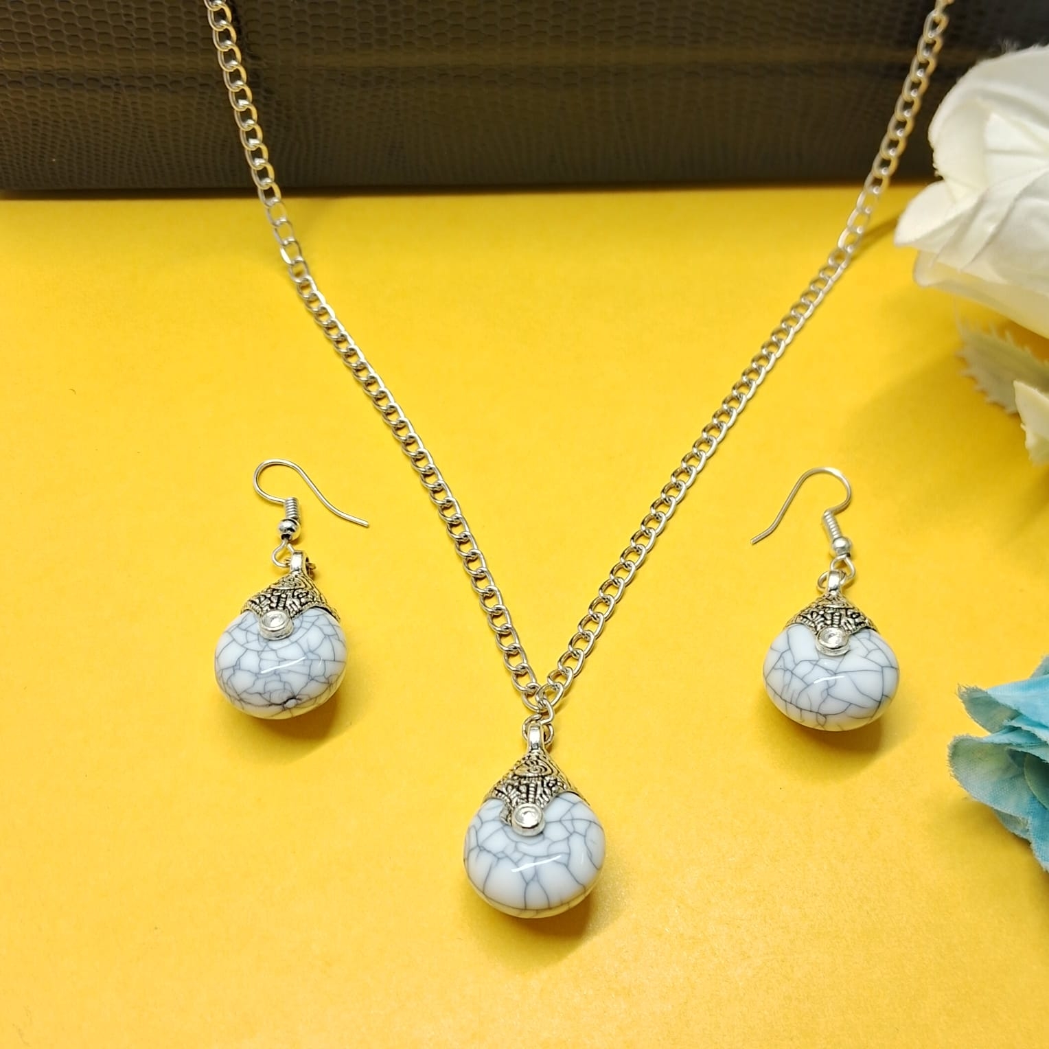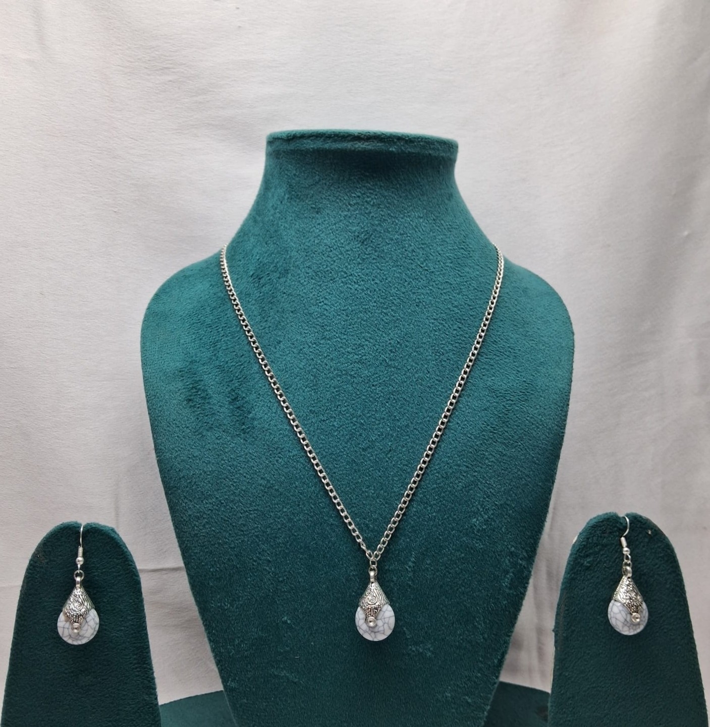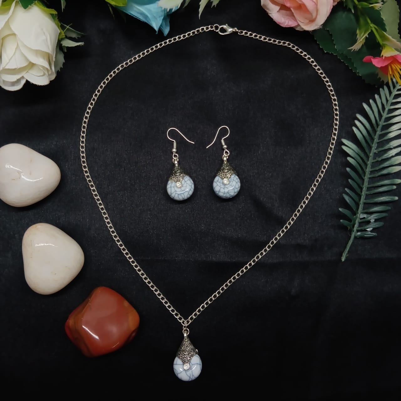 Made in Delhi, this set pairs cool grey crackle-finish stones with intricately detailed silver-tone alloy caps in a teardrop arrangement. The cap that holds each stone is worked with fine scroll and floral patterning, tapering to a point at the top where it connects to the chain or earring fitting. A small rhinestone accent sits at the very top of each cap, catching light quietly without drawing attention away from the stone itself. The necklace hangs from a silver-tone curb-link chain with a lobster clasp, while the matching earrings carry the identical stone-and-cap pairing on fish-hook fittings. The cool grey of the stone and the warm silver of the metal setting create a pairing that feels balanced and timeless.