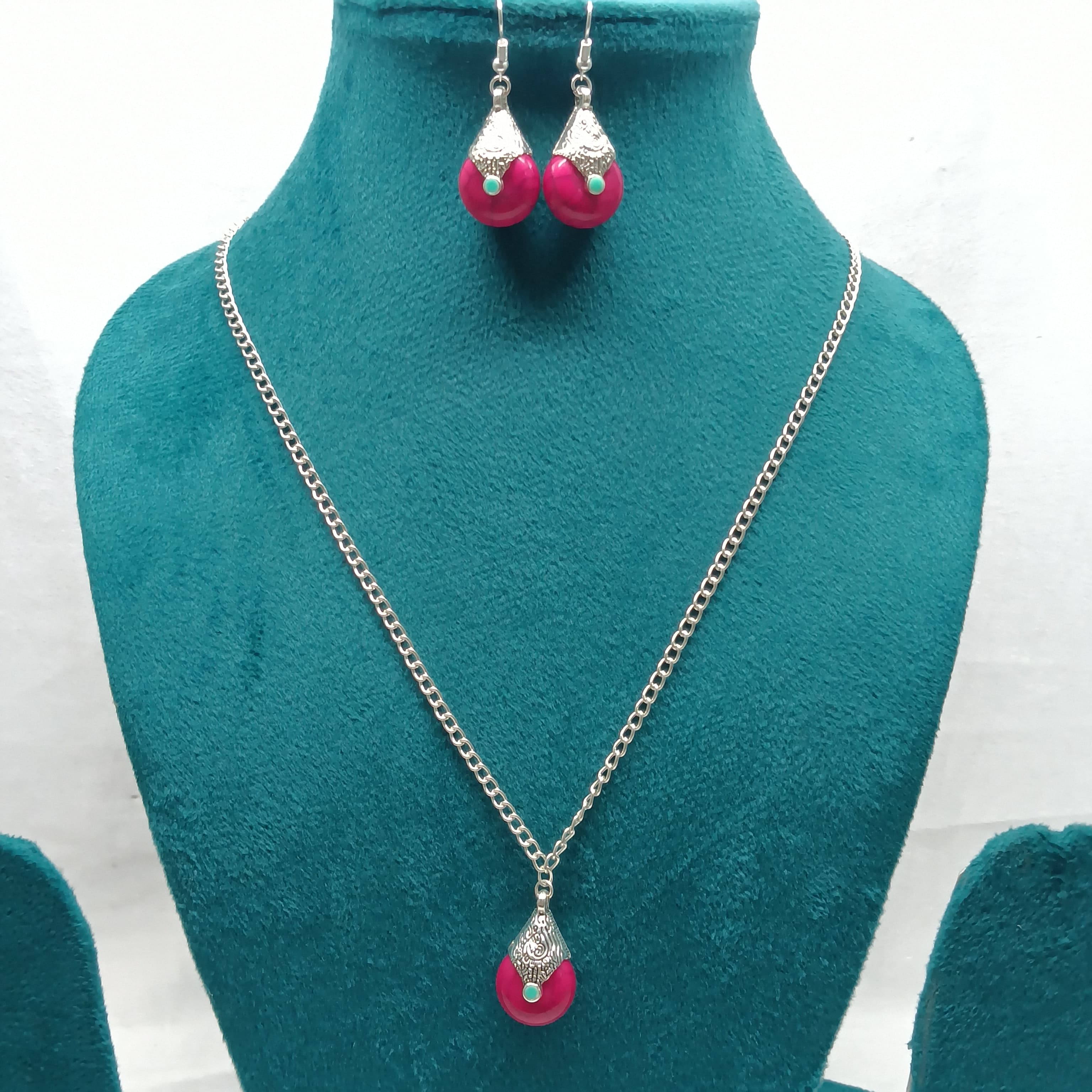 Made in Delhi, this set brings together a simulated gemstone in a rich pink-fuchsia tone with a silver-tone alloy cap setting that carries a fine filigree pattern and a small turquoise accent at its centre. The teardrop-shaped stone sits snugly within the ornate cap, which tapers to a point and connects to a silver-tone curb-link chain with a lobster clasp and extender. The matching drop earrings replicate the exact same stone-and-cap design on fish-hook fittings, creating a set that feels deliberate and cohesive rather than merely coordinated. The contrast between the intricate metalwork of the cap and the smooth, glossy surface of the pink stone is what gives the set its visual interest.