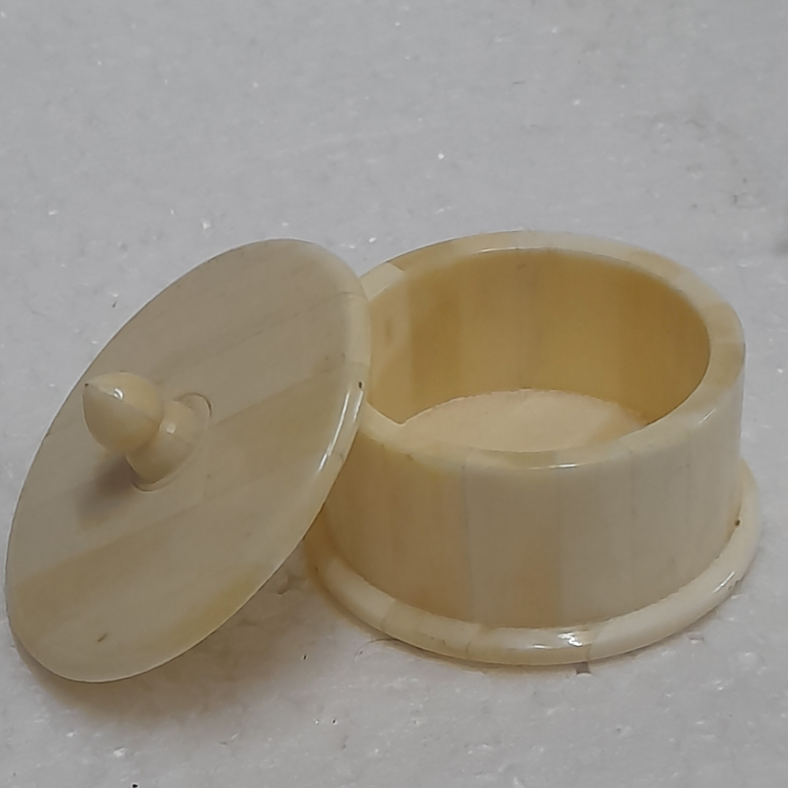 We are here to present a very unique handicrafted solid boan box in off white colour round in shape.