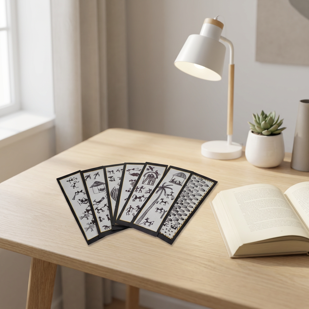 - A complete set of 7 handmade bookmarks with unique Warli designs