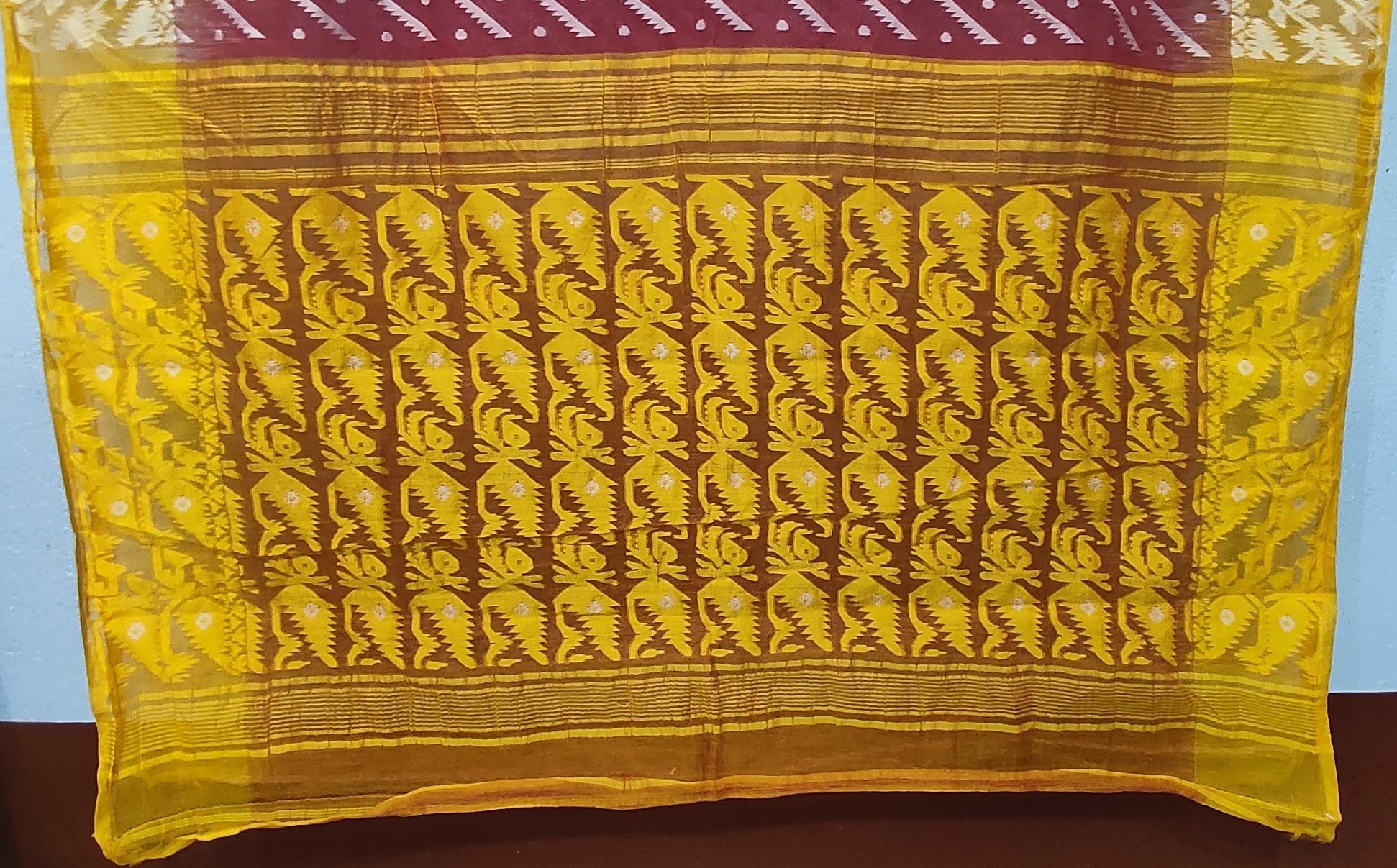 Embrace the timeless beauty and vibrant spirit of Bengal with this exceptional mixed cotton Jamdani saree. It is a piece that carries the legacy of generations of weavers, transforming simple threads into an heirloom-quality garment. When you choose to wear this maroon and yellow tapestry, you are not just selecting an outfit; you are choosing to celebrate an art form and stepping into a spotlight reserved for true connoisseurs of style.