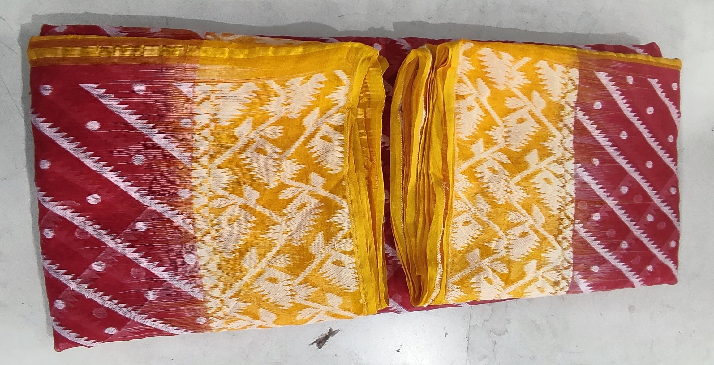 Drape yourself in the fiery elegance of the handloom Bengal mix cotton Jamdani saree, a masterpiece that effortlessly blends deep tradition with contemporary style. This striking saree, featuring a captivating maroon body and a vibrant yellow border, is designed for the individual who chooses to command attention. It is more than just attire; it is a statement piece, perfectly suited for weddings, grand festivals and any occasion where making a bold, memorable impression is key. The rich, intense hue of the maroon plays off the sunny yellow for a look that is both dramatic and joyful, reflecting the vivacity of Bengal’s textile heritage.