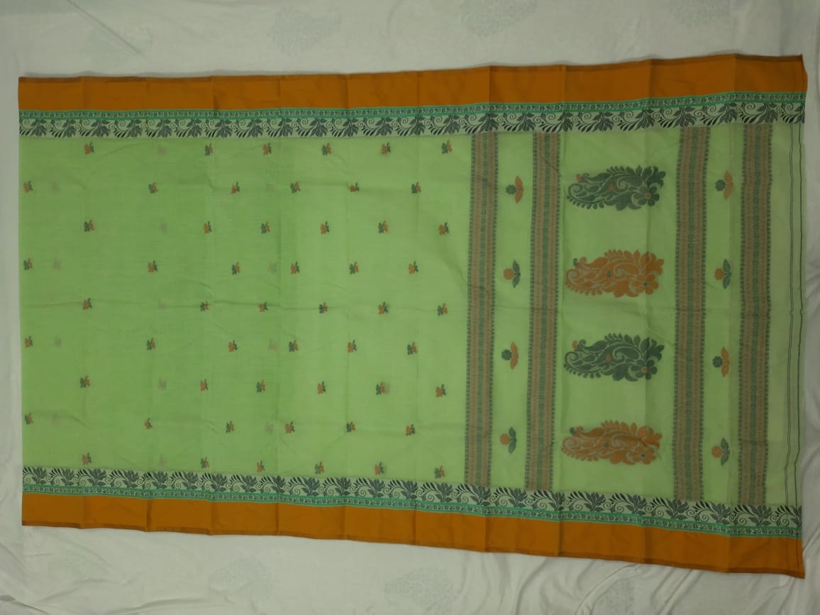Step into the serene elegance of a handcrafted cotton saree that tells a silent story of tradition and artistry. This green handloom cotton saree is more than just attire; it is a piece of West Bengal’s rich weaving heritage, a beautiful blend of comfort and understated style. Draped in this fine cotton, you carry with you the peaceful, earthy tones of nature and the gentle rhythm of the loom that brought it to life. This saree offers a unique opportunity to embrace sustainable fashion without compromising on classic beauty, making it a perfect addition to your everyday wardrobe.