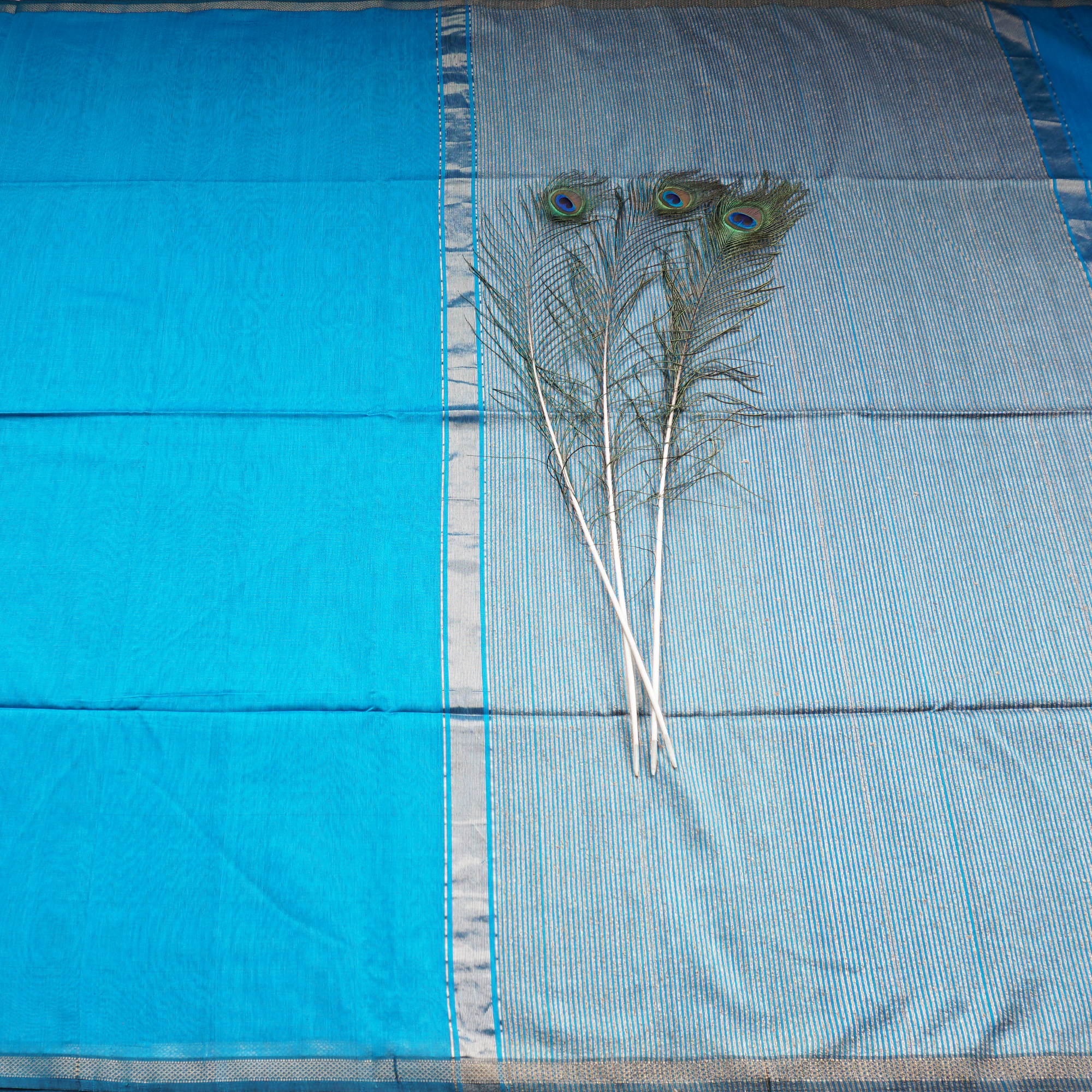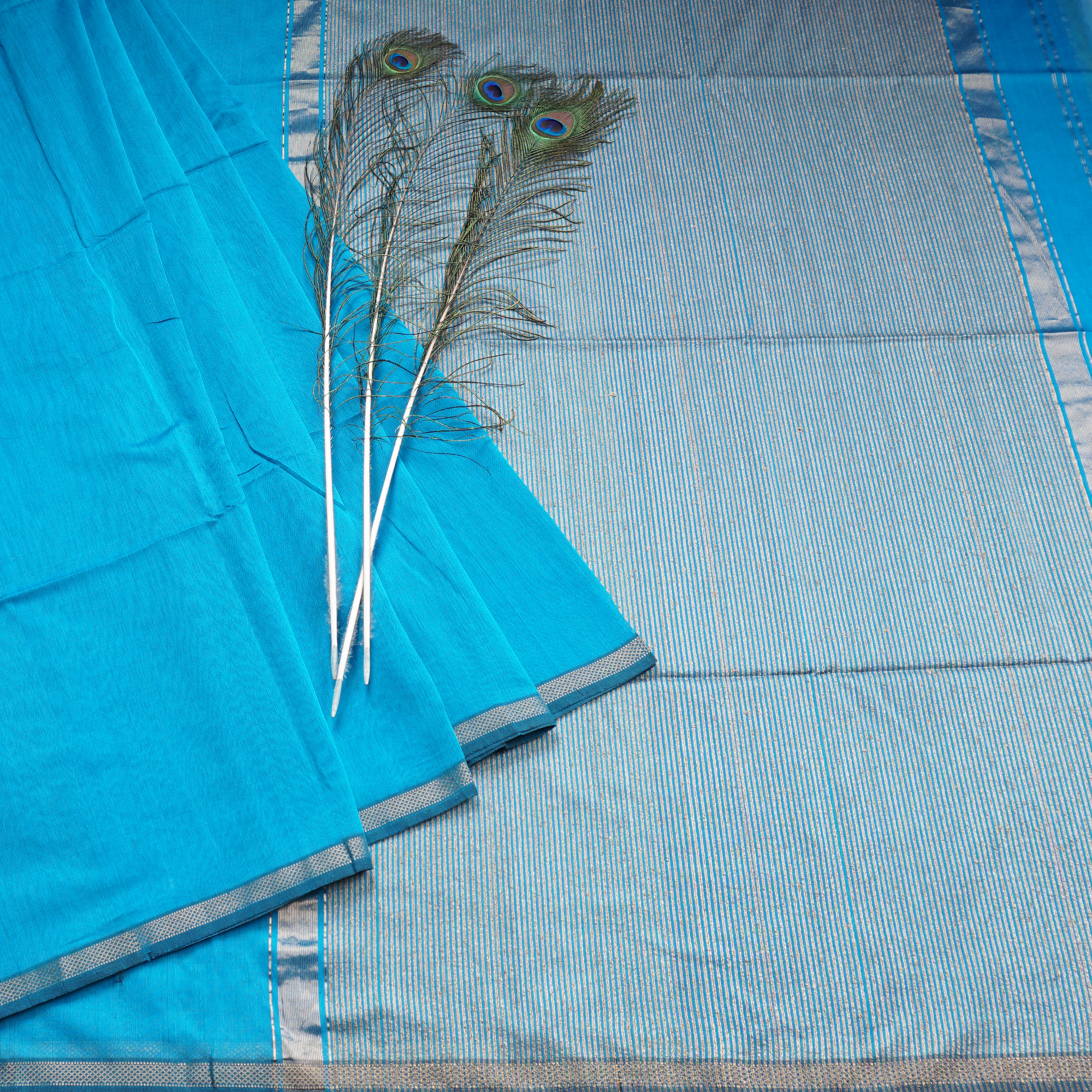 Crafted in a calm sky blue shade, the Handloom Maheshwari Kosa Padar Saree is a traditional masterpiece from Madhya Pradesh. This saree, which is made of luxurious cotton silk, blends the sophistication of Kosa silk with the breezy comfort of cotton. It comes with a matching blouse piece and has the unique Maheshwari Padar (border) design, making it ideal for both formal and festive settings.