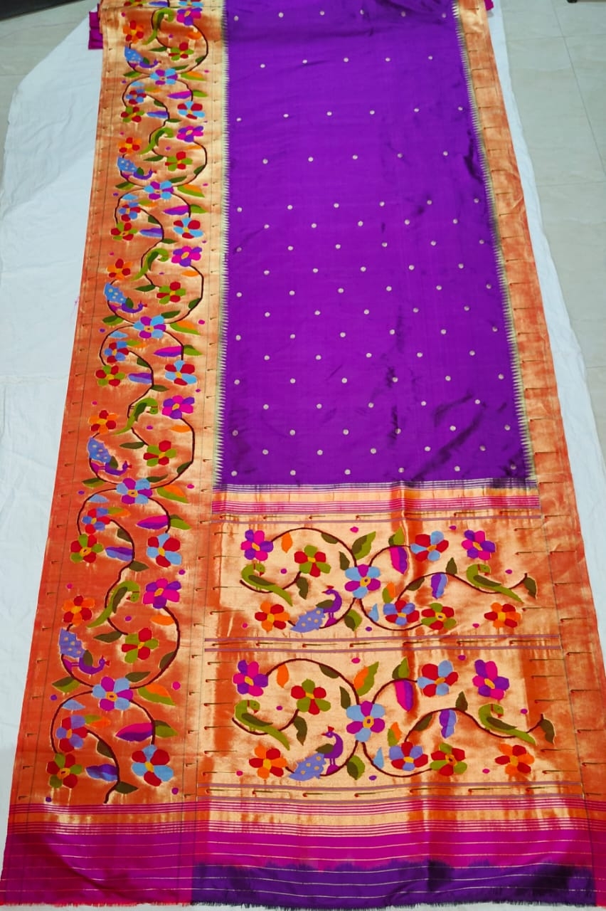 Step into timeless elegance with the handloom Paithani silk purple saree, an exquisite creation that reflects the regal charm of Maharashtra’s handloom tradition. Woven in pure silk, this saree showcases a rich royal purple base sprinkled with golden polka dots, giving it a subtle yet captivating sheen. The highlight lies in its broad golden-orange border, magnificently adorned with floral and peacock motifs in shades of red, blue, green, pink and purple, a stunning symphony of colour and craftsmanship. Perfect for weddings and festive occasions, this saree carries an aura of grace and grandeur that transcends trends.