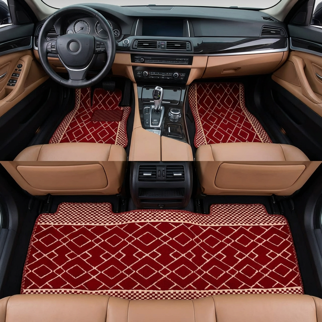 Most of us spend a surprising amount of time in our cars, yet we rarely think about making that space feel as considered and comfortable as our homes. The handloom polyester chenille yarn car carpets change that. Deep maroon with cream geometric patterns running across the surface in neat, repeating diamond formations — this set of three carpets turns the inside of your car into something that feels genuinely well put together.