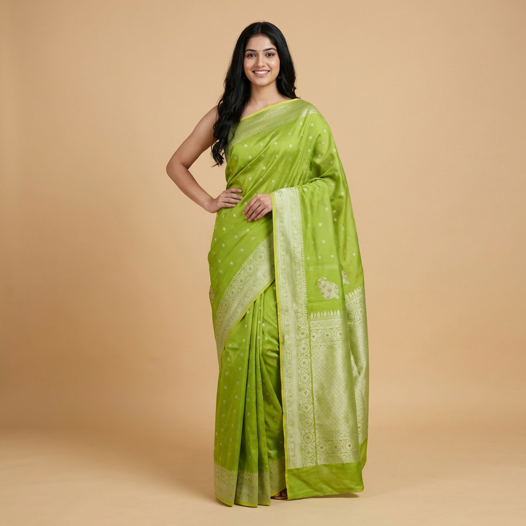 There's something extraordinarily special about draping a handloom silk saree that carries within its threads the legacy of generations. This vibrant green silk butta saree is not merely a garment but a piece of living history, woven with precision and passion by the skilled artisans of Telangana. The lustrous fabric catches light beautifully, while the intricate buttas scattered across the body tell stories of an ancient craft that continues to thrive in modern India.