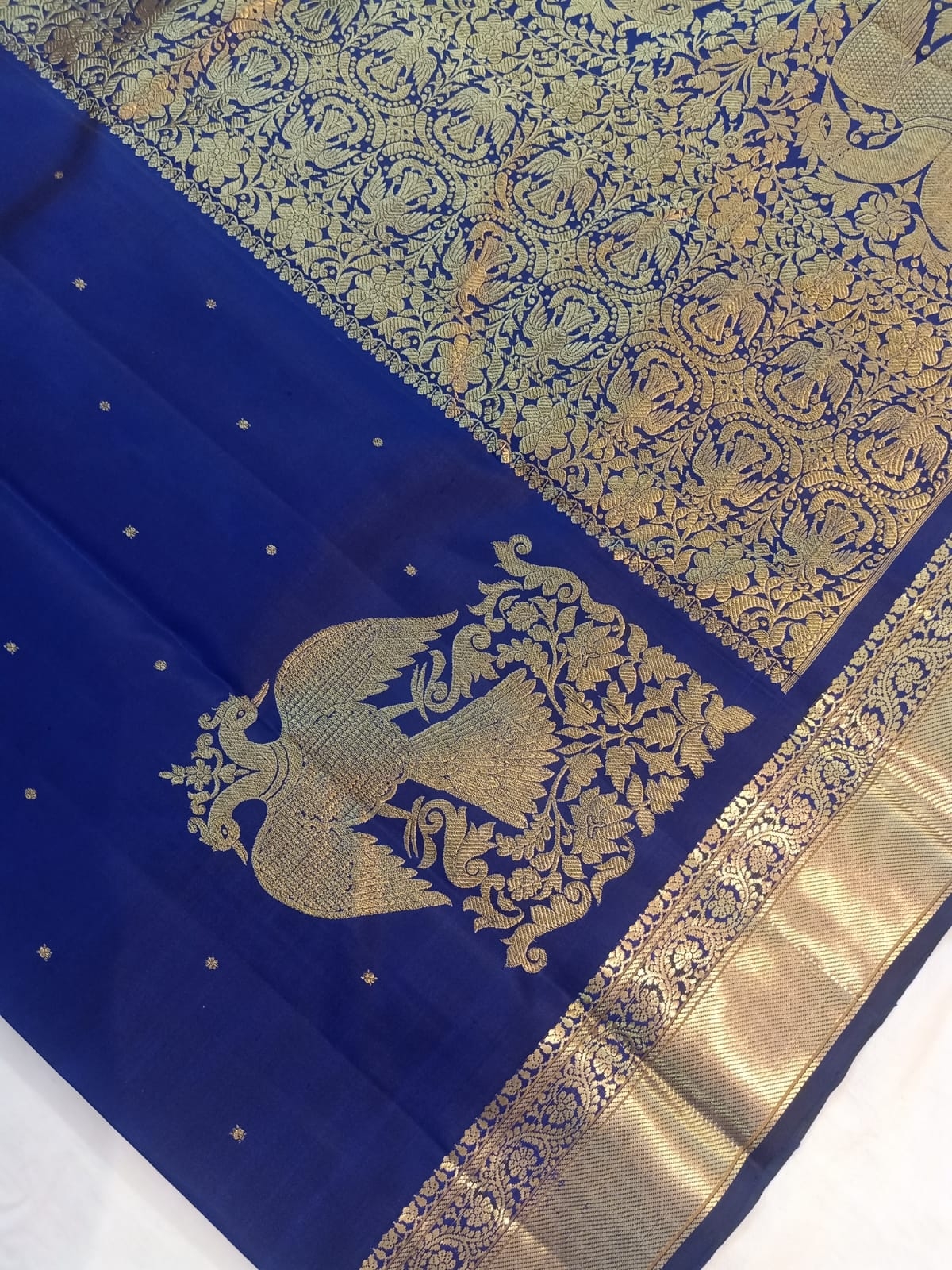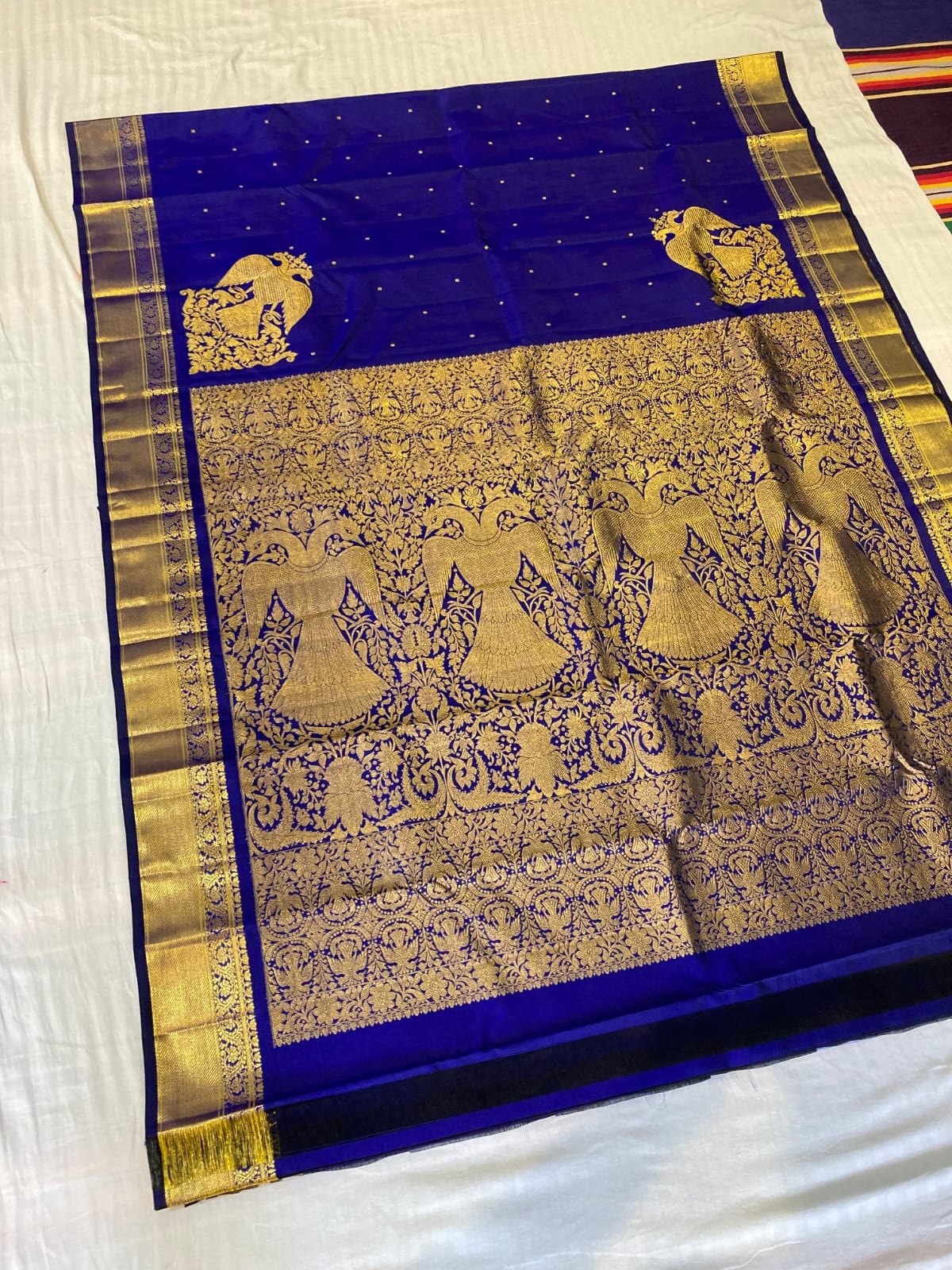 The majestic Gandaberunda, a mythical two-headed bird of strength and power, often adorning the pallu (as seen in this piece), is more than just a pattern. It is a motif from the royal emblem of the erstwhile Mysore kingdom, symbolising valour and majesty. Each gold thread, meticulously woven against the deep, celestial blue, isn't just decoration; it's a prayer, a blessing and a continuation of an artistic heritage passed down through whispered secrets and calloused hands. To choose this saree is to honour this rich tapestry of skill and history.