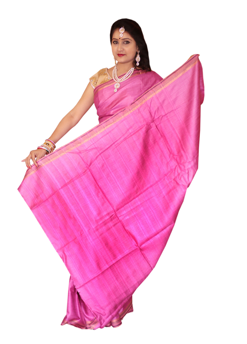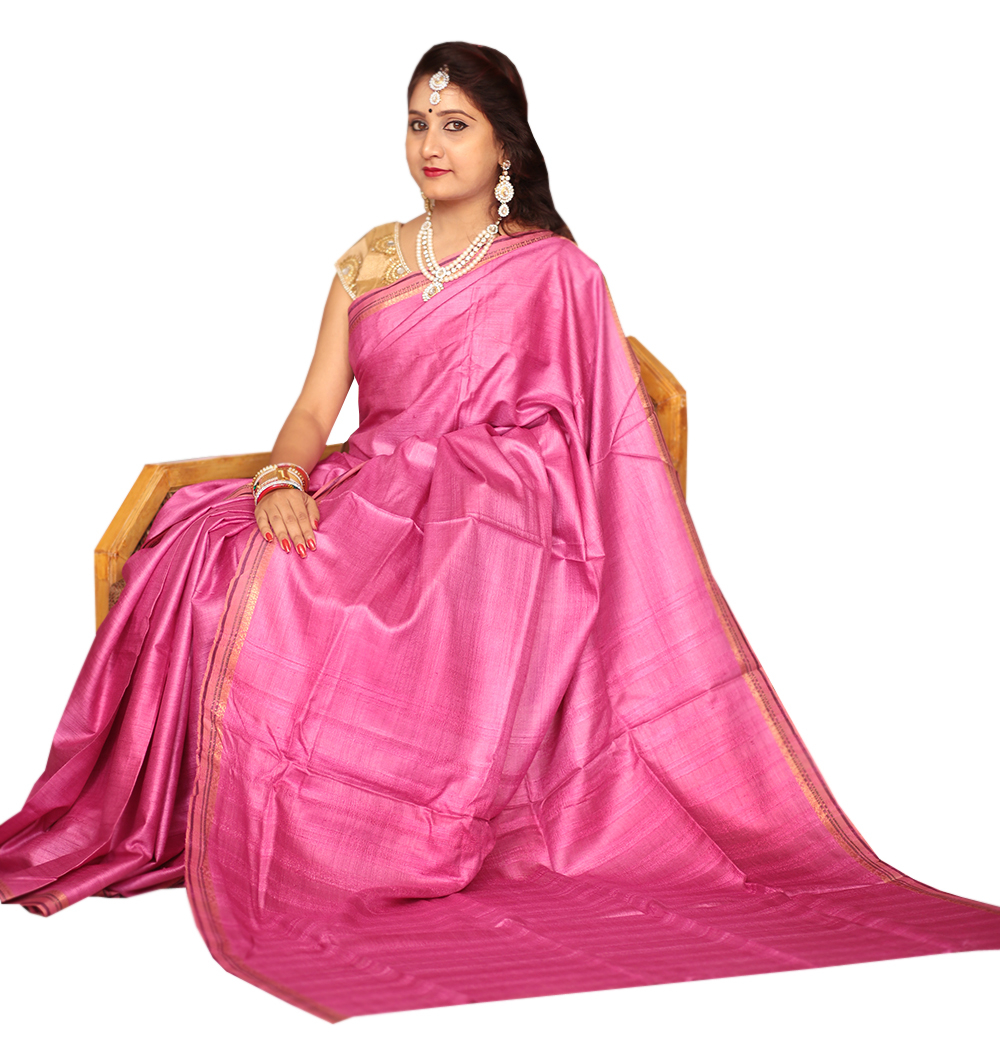 Pink tasar silk saree, handloom silk saree from Jharkhand, pure wild silk saree, Silk Mark certified saree, sustainable Indian saree, eco-friendly silk saree online, artisan made tasar saree, pink silk saree for festivals, handcrafted silk saree India, ethical fashion saree