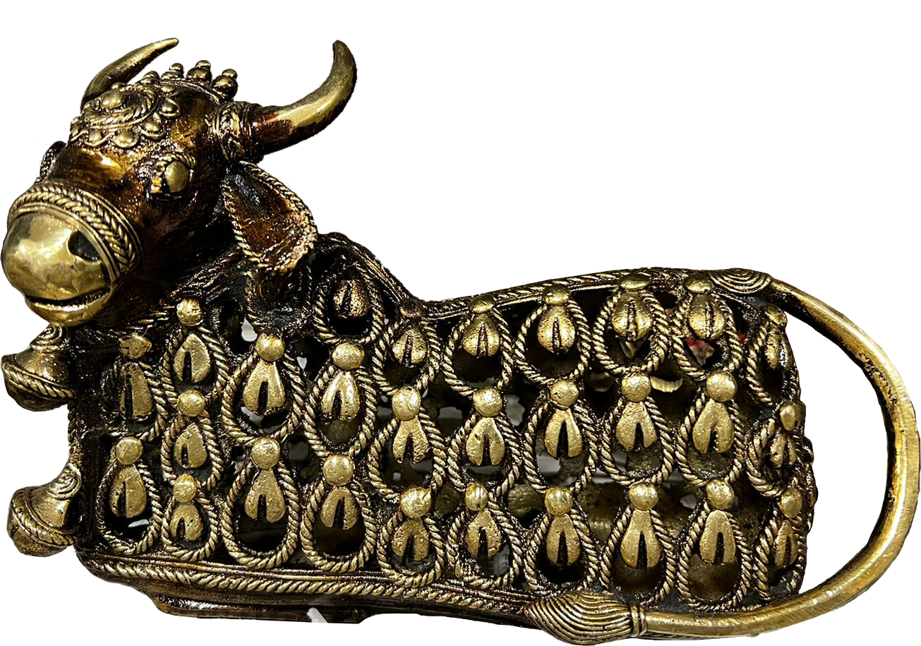 The Brass Nandi features intricate engravings and a rich golden finish, reflecting traditional Dhokra artistry. Symbolizing strength and devotion, this sculpture holds a special place in Hindu mythology as the guardian of Lord Shiva. Each piece is a testament to the skilled craftsmanship of tribal artisans, making it a unique and auspicious addition to your decor.