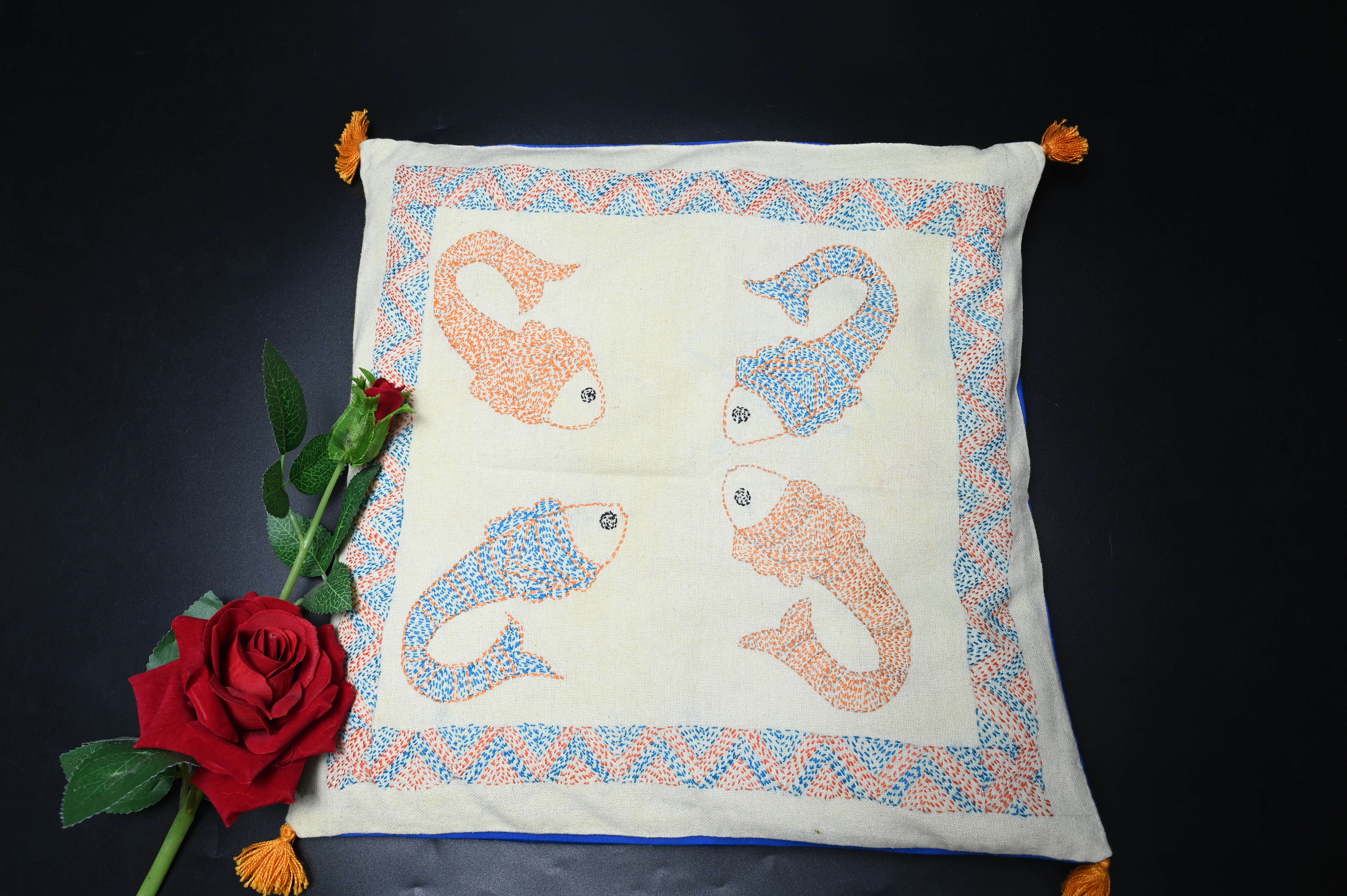 Each stitch on this beauty is a labour of love, meticulously done by skilled artisans who've honed their craft for generations. The pristine white fabric is the perfect canvas for the vibrant fish design, adding a pop of colour and a touch of tradition to your space.
