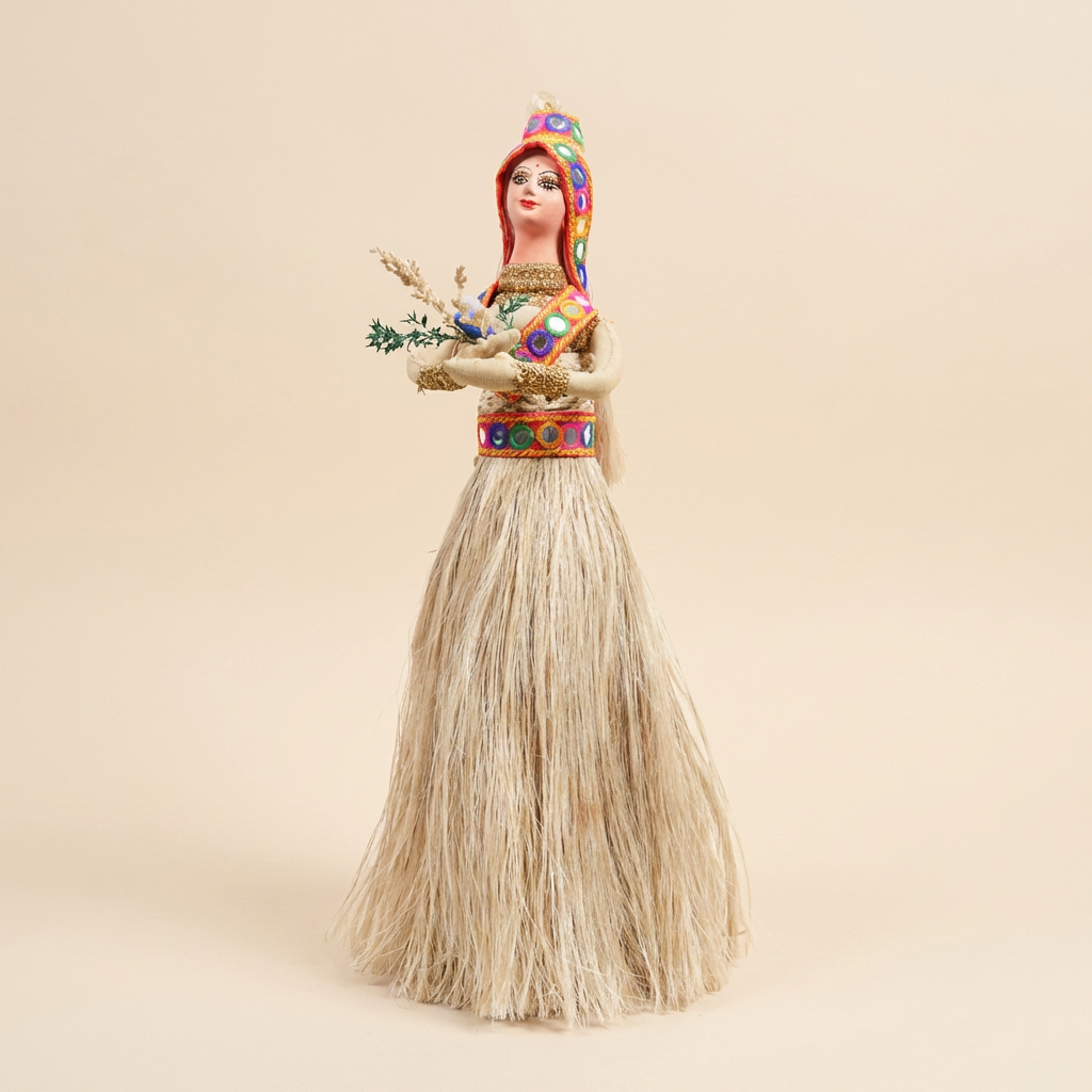 Jute is a hardy natural fiber, but it thrives best when treated with a little care. To keep your doll looking fresh, avoid placing it in areas with high moisture or direct sunlight, as prolonged exposure can dampen the fiber or cause it to fade. Since the doll features delicate mirror work and loose jute strands, do not use water to clean it. Instead, use a soft-bristled brush or a hairdryer on a cool, low setting to gently blow away any settled dust. If there is a stray fiber, simply tuck it back or trim it neatly with a pair of scissors. Proper storage in a dry environment will ensure that the golden fiber retains its natural sheen for decades.