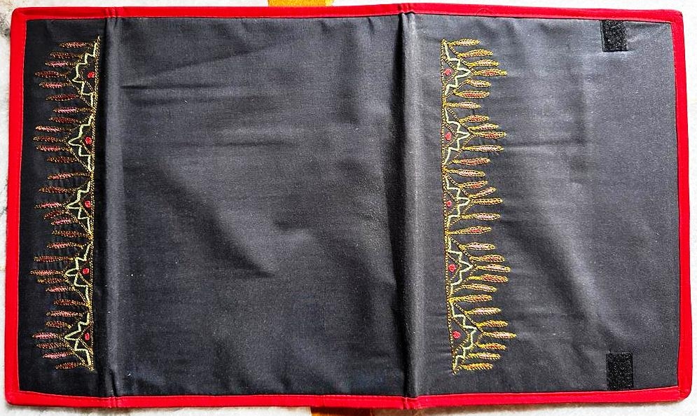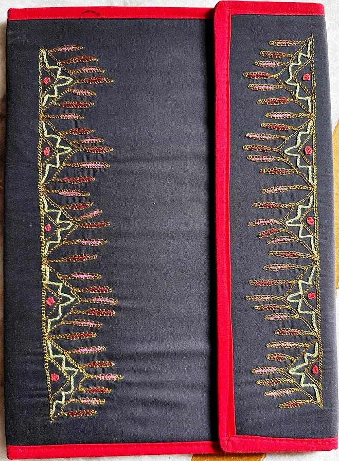 What sets this folder apart is its hand embroidery—a skill passed down from generation to generation in Gujarat’s artisan communities. Long before factory-made office supplies took over, families and community groups hand-stitched covers for ledgers, scripts, and documents. They embroidered patterns not for show, but as symbols of identity, tradition, and pride in their work.