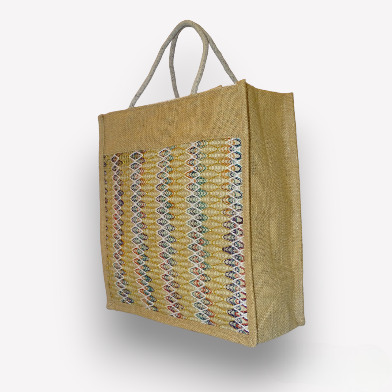 A beautiful looking bag with inside lamination and a multi-coloured net on the front side of the bag which makes it look aesthetic. This bag is made of 100% pure jute and is totally enviroment friendly. Jute is one of the strongest fibres in the world and is capable of carrying heavy loads because of the jute fibre as it is super strong in nature, It can be used to carry books,Groceries, etc. This jute bag can long last as it is highly durable because of the strong jute fibers, Jute bags can last upto 4 years and they are fully biodegradable & Recyclable.