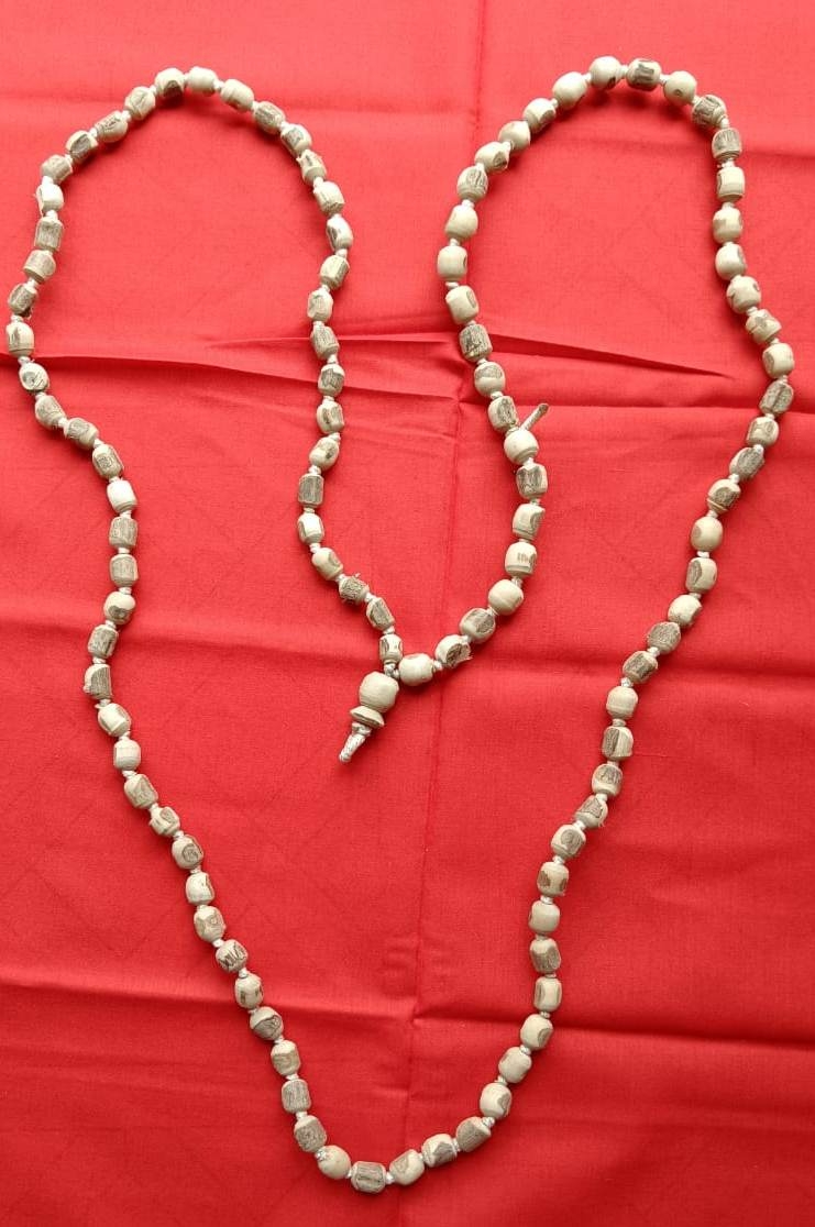 There is no machinery here—only skilled hands, small tools, and deep reverence. Each of the 108 beads is carefully smoothed and strung on a sacred thread, often accompanied by a larger “guru bead” that marks the starting point of the mala. This process ensures that every mala is authentic, sacred, and ready for spiritual use.
