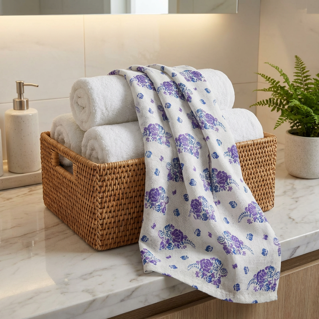 There is a distinct comfort in the simplicity of a traditional Indian household, and perhaps nothing embodies that comfort more than the humble Thorth. It is more than just a towel; it is a piece of cultural identity that has dried the faces and graced the shoulders of generations. Our handmade printed white Thorth brings this Kerala classic into your modern lifestyle, blending the utility of a traditional weave with a refreshing floral aesthetic. Draped over a chair or neatly folded in your travel bag, this piece speaks of a lifestyle that values slow living and natural materials. Its crisp white base, adorned with delicate violet floral patterns, offers a visual lightness that matches its airy feel, making it an essential companion for those who appreciate the finer, quieter details of everyday luxury.