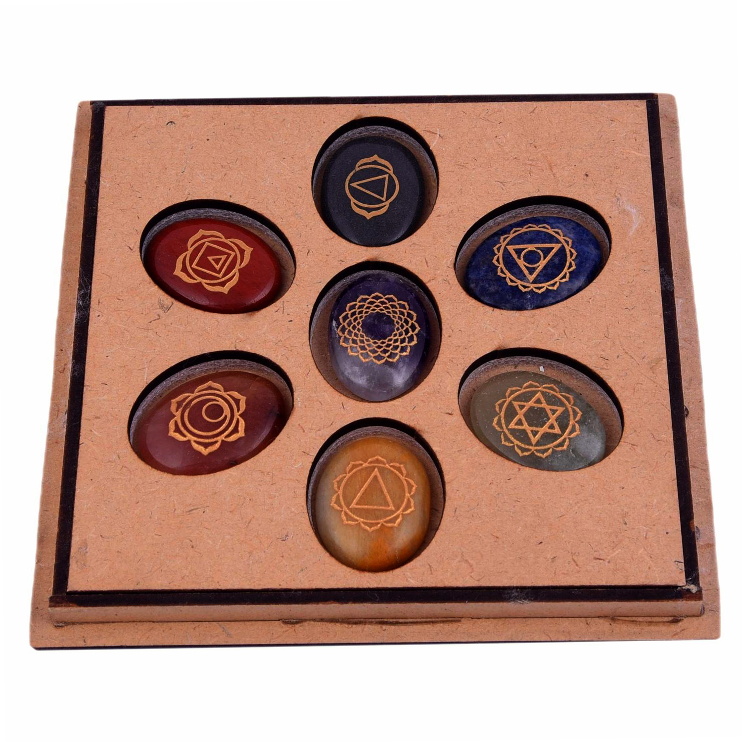 | 7 Chakra Stones Set Box Engraved, Spiritual Healing Meditation Plam Stones, Reiki 7 Chakra Crystal Set in Wooden Box |
