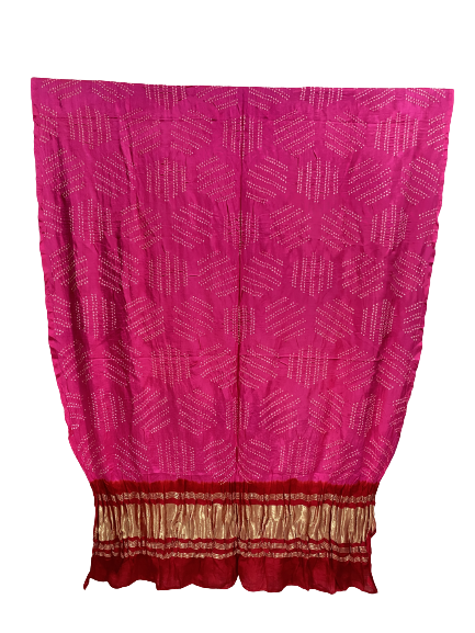This handcrafted pink silk Bandhani dupatta measures 250 x 135 cm, offering ample flow and grace for draping across shoulders or pairing with traditional attire. It features a fine crinkled texture that’s characteristic of authentic Bandhani and is dotted with thousands of tiny specks—each one tied by hand.
