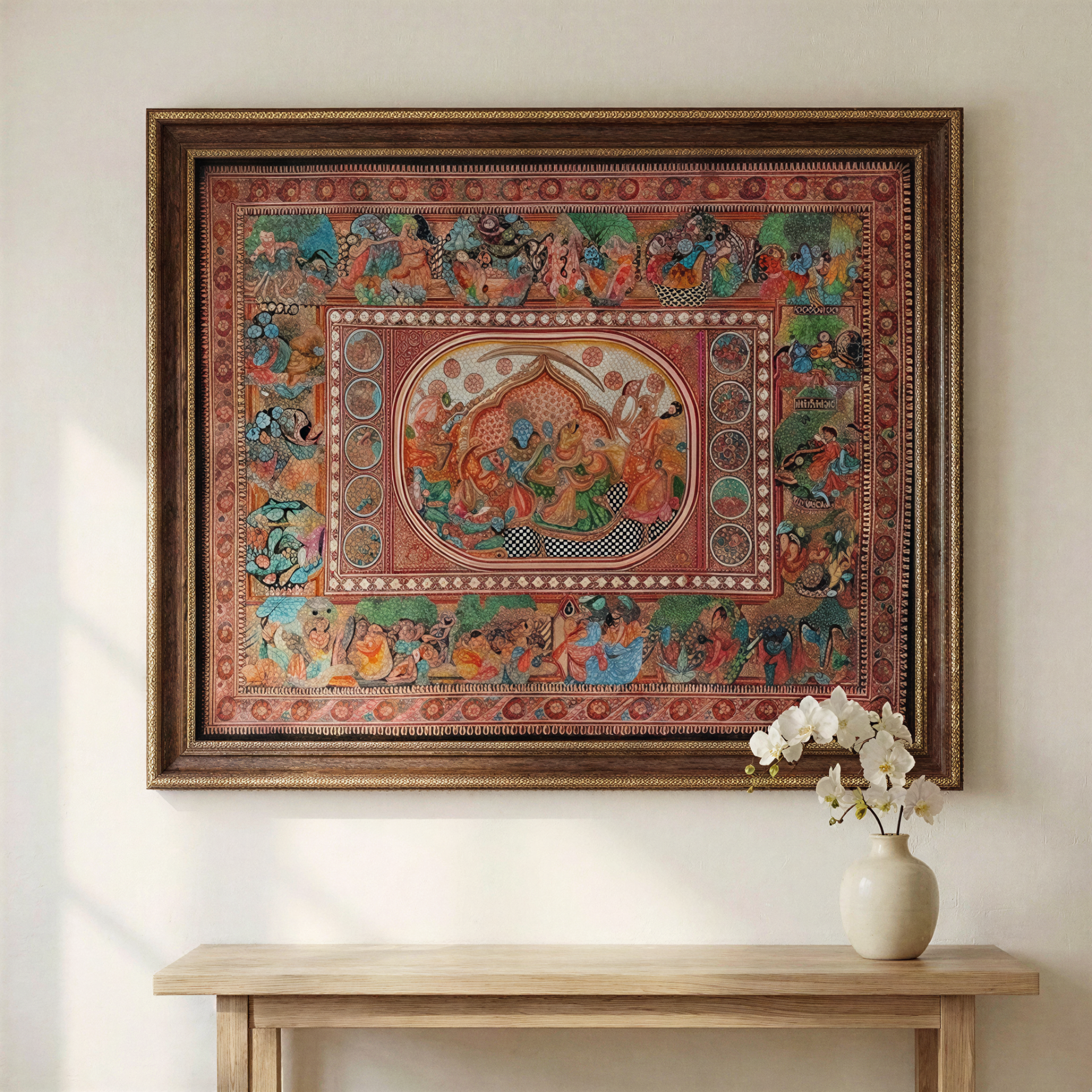 The art of leather painting from Andhra Pradesh, known as Tholu Bommalata in its puppet form, has deep roots in the storytelling traditions of South India. Artisans first clean and tan the goat leather using natural processes, stretching and drying it until it achieves just the right texture. The colours used are derived from natural sources — minerals, plants and organic pigments — giving the finished piece that warm, earthy richness that synthetic paints simply cannot replicate. Every stroke is applied freehand, making each painting entirely one of a kind.