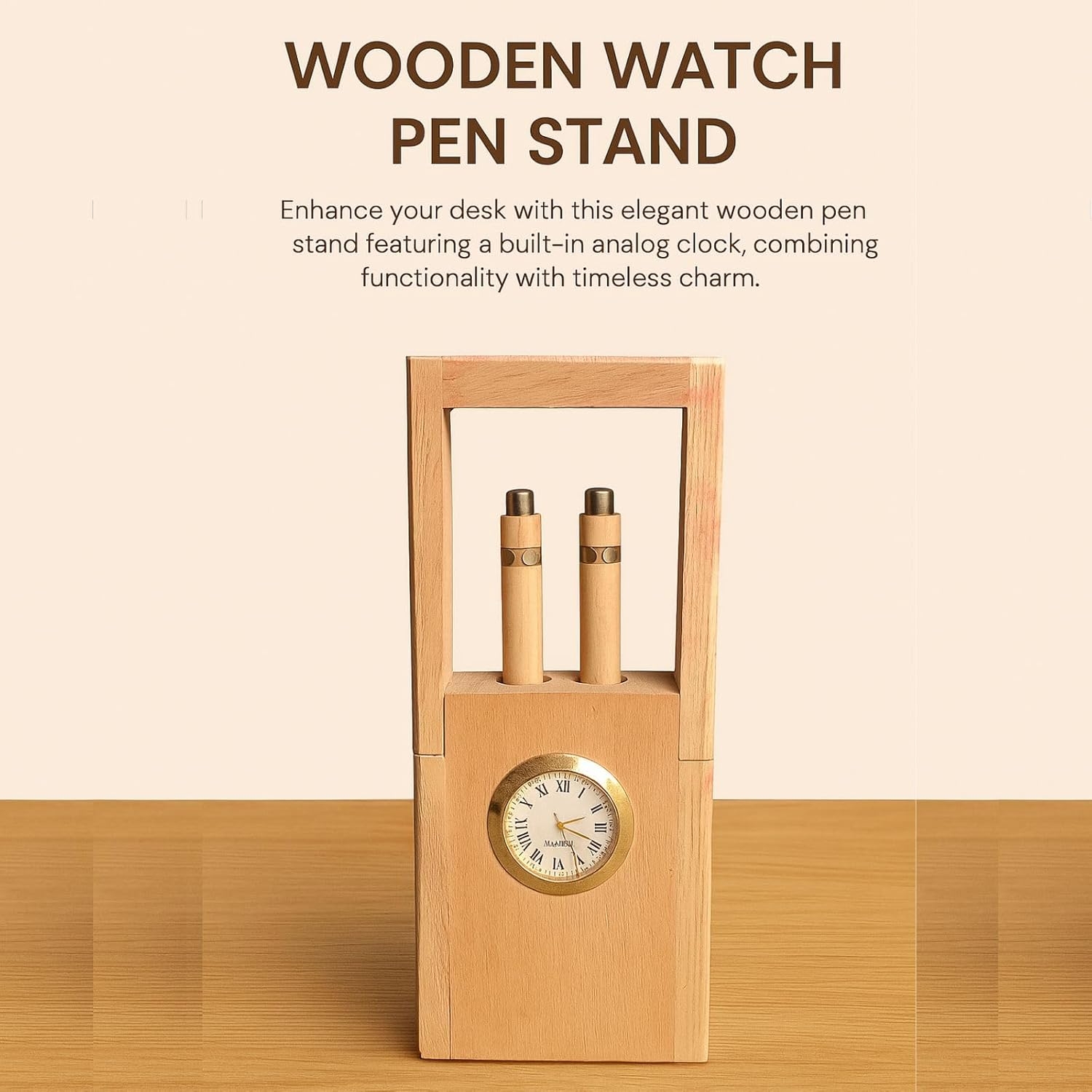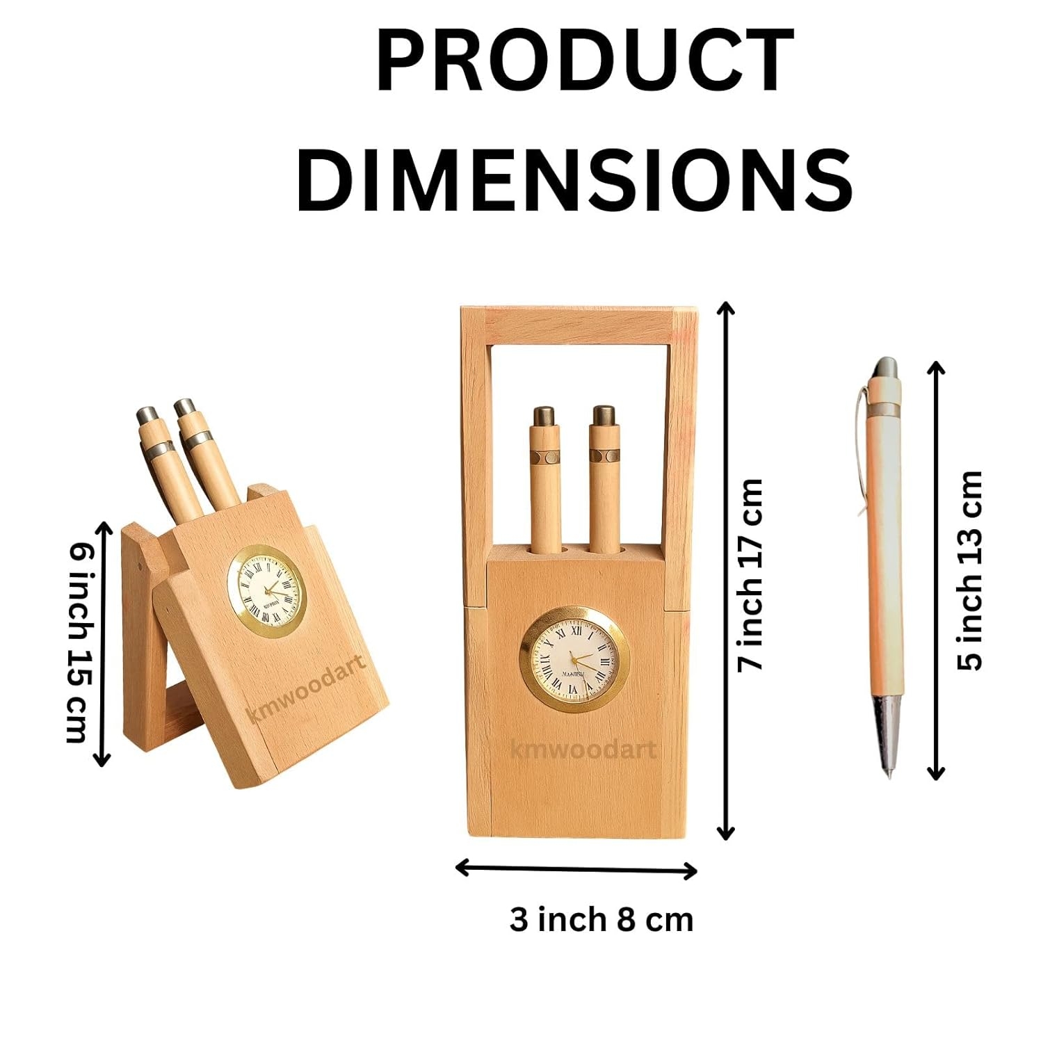 Handmade Wooden Pen Stand with Clock | 8x3x13 cm