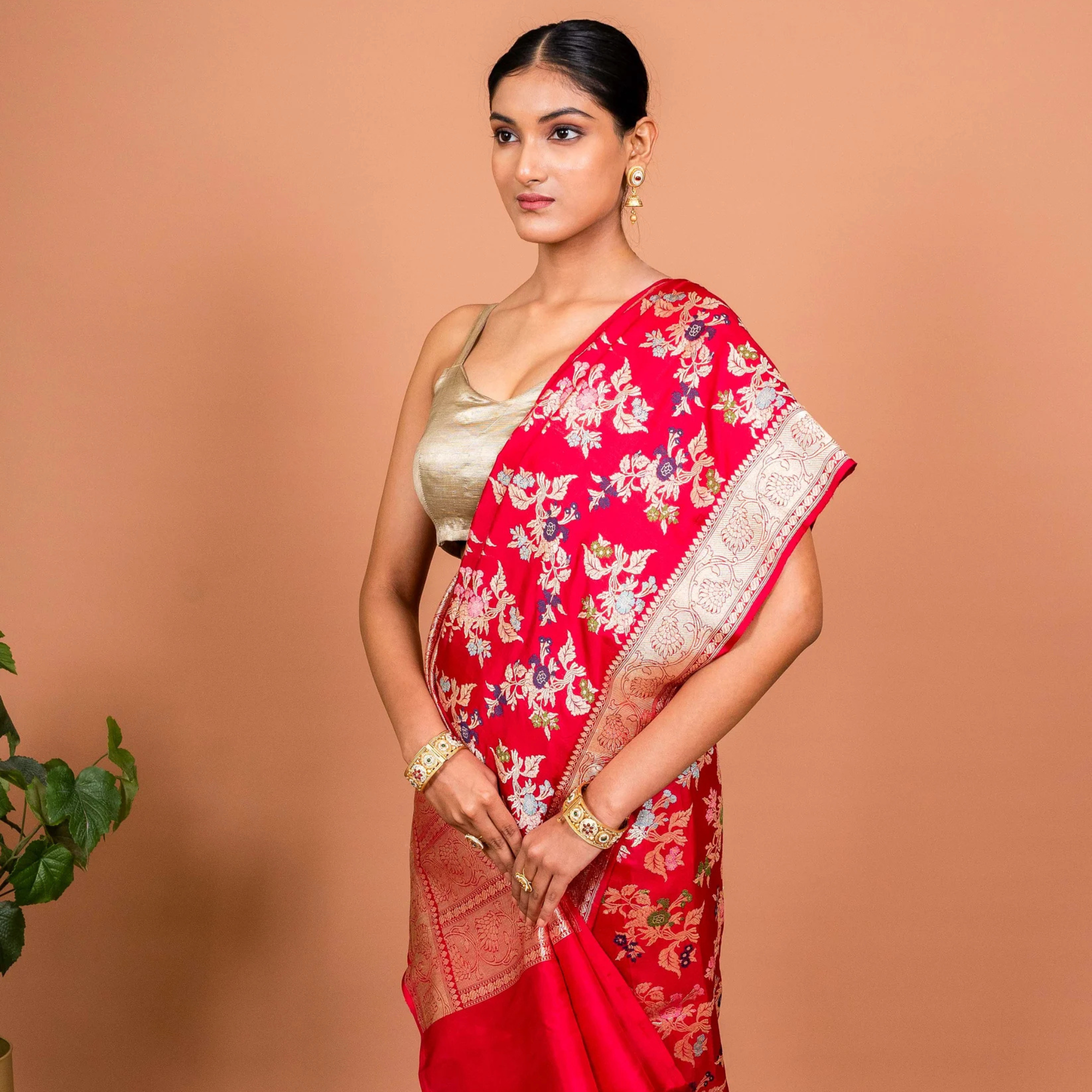 This saree is an authentic handloom creation, a testament to the purest form of Indian textile art. It features a classic red hue that is elegant, powerful and timeless. The fabric is pure handwoven silk, meaning it is light, smooth and drapes perfectly for any figure. Its design incorporates Exquisite woven detailing, such as the vibrant floral patterns and the elegant golden zari border visible in the image, showcasing a subtle blend of tradition and modern finesse. This is authentic Banarasi craftsmanship, an heirloom designed to last a lifetime, making it the ideal choice for a Wedding or any grand, festive occasion.