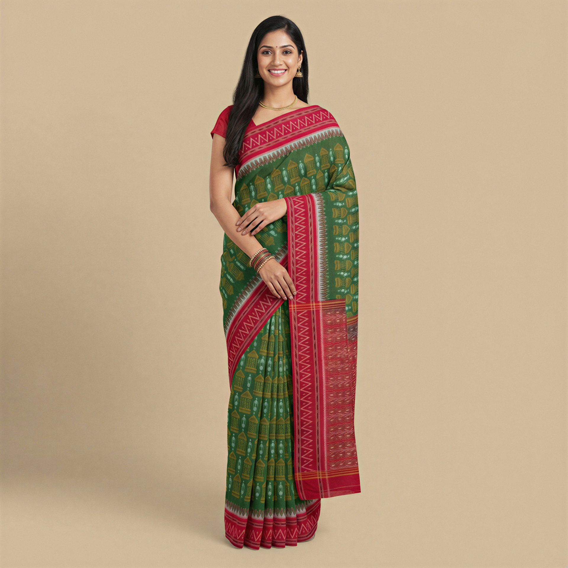 Olive and maroon is not a combination that shouts; it draws you in slowly, the way good craft always does. This Sambalpuri Single Ikat Cotton Saree carries that quality effortlessly. The deep olive green body, filled with woven temple and human figures, meets a rich maroon border and pallu that together make for a saree that is traditional at its core yet completely contemporary in how it wears.
