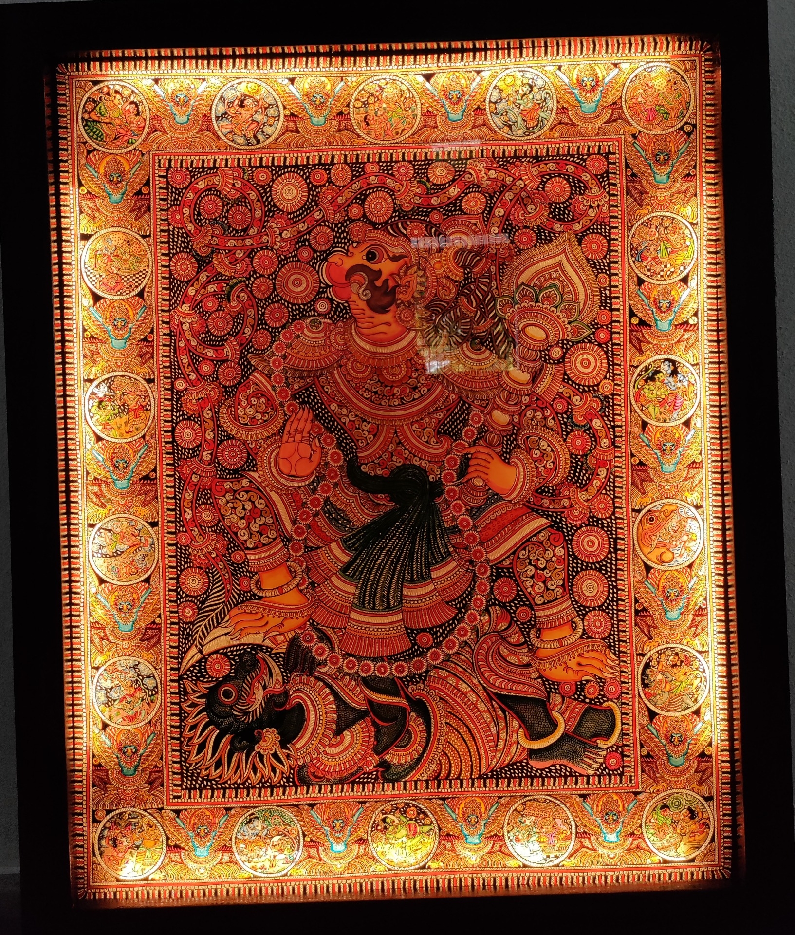 Each Hanumantha Raya leather painting is created from naturally tanned goat leather, a time-intensive process that ensures the material retains its flexibility and strength while being completely eco-friendly. The colours are not synthetic but come from camel waterproof inks, giving the painting a radiant finish that does not fade with time. Encased in a durable teak wood frame and protected by acrylic sheets, this piece is built to last for generations.