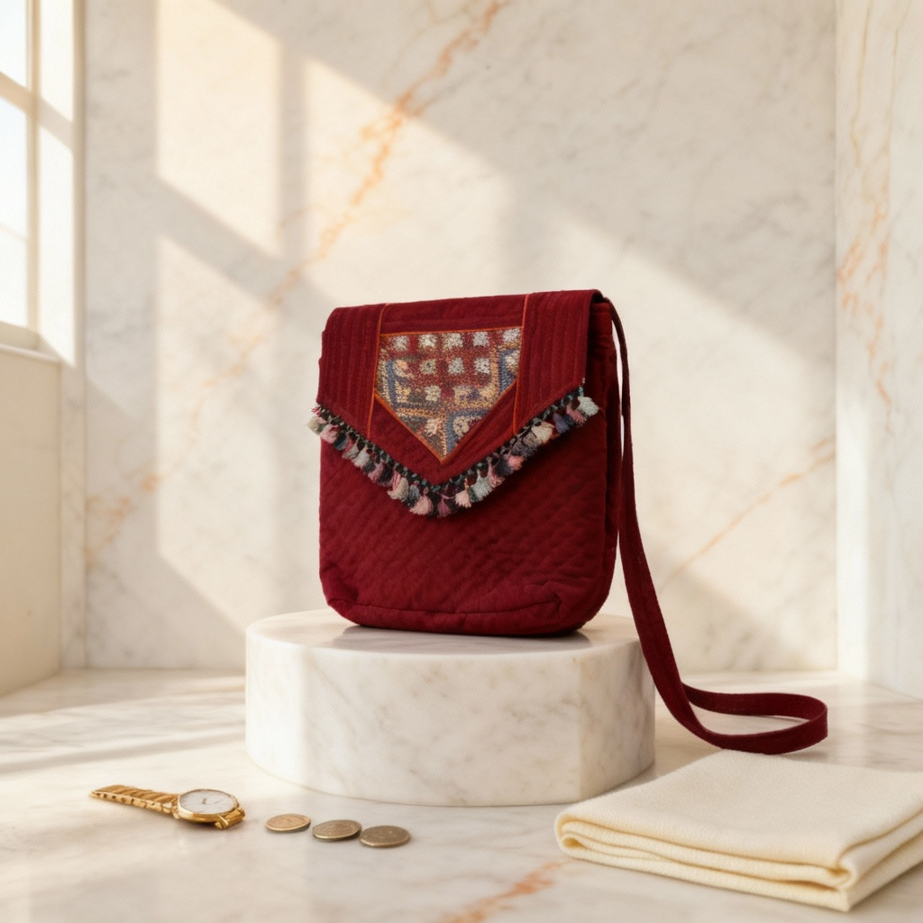 In the remote villages of Kutch, Gujarat, the Kharek embroidery style has flourished quietly for generations. Created by women of the Meghwal and Marwada communities, this form of needlework is characterized by its tight geometric patterns, counted-thread technique, and intense discipline. The art demands mathematical precision, steady hands, and immense patience. This handcrafted maroon cotton sling bag carries the weight of that history, shaped not in factories, but by skilled fingers who continue to preserve their ancestral knowledge. Every stitch is a silent conversation between past and present, heritage and functionality.