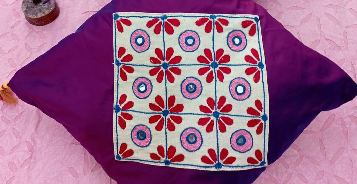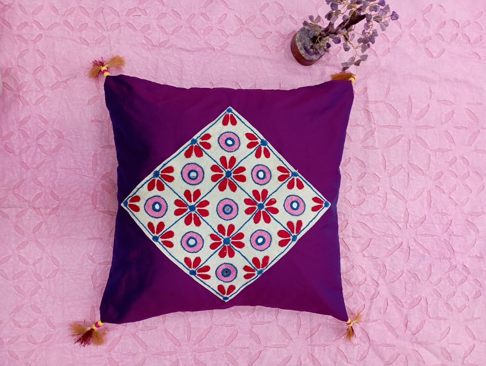 Elevate your home decor with the opulent charm of our handcrafted Embroidery and Mirror Work Cushion Cover. Made from luxurious purple silk fabric, this exquisite piece features intricate embroidery and dazzling mirror work, bringing a touch of regal elegance to any room.