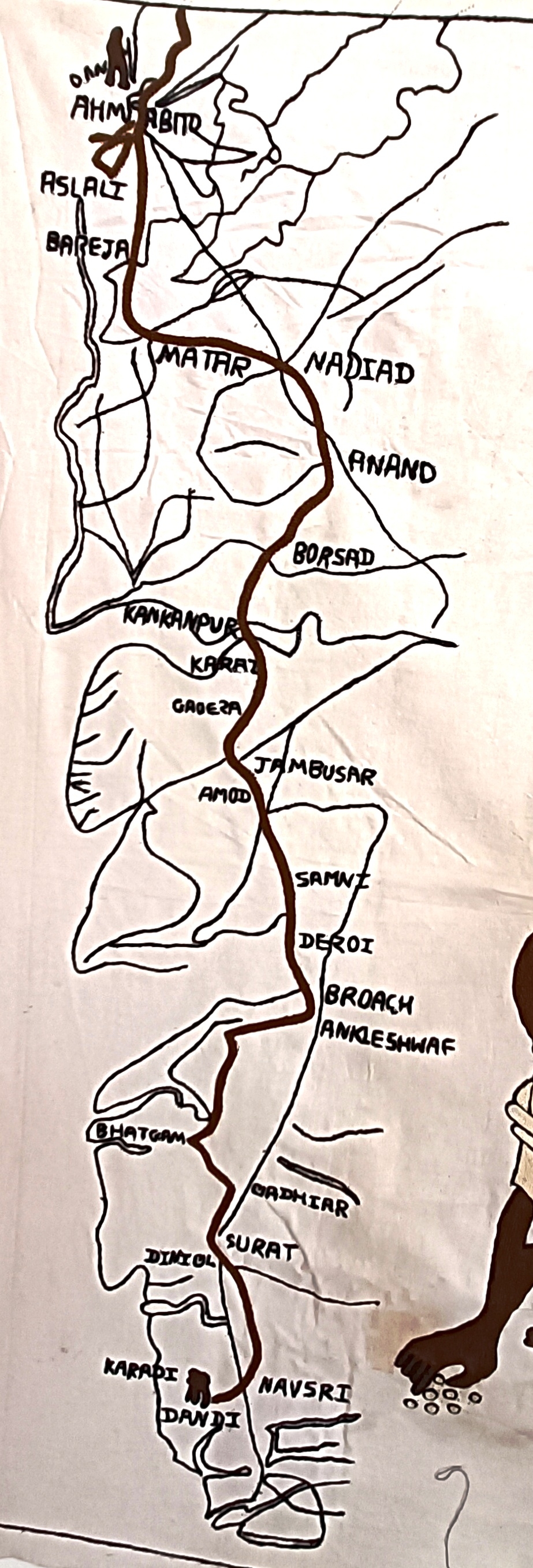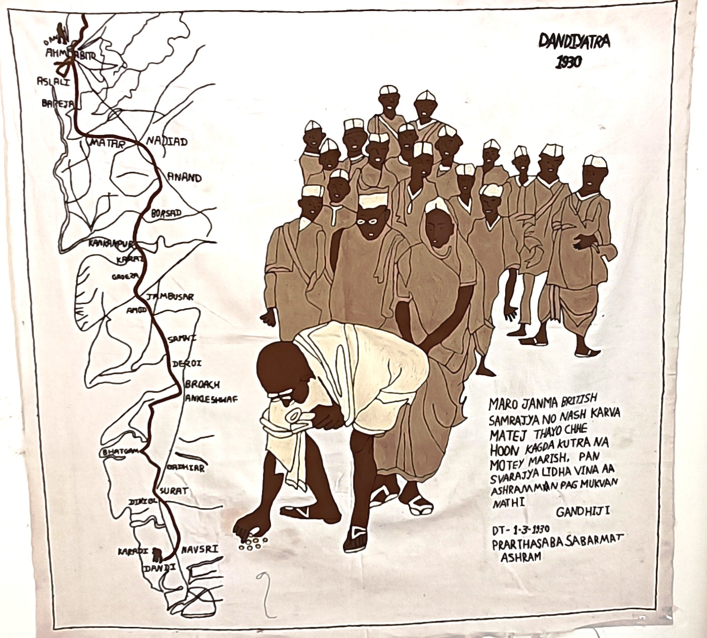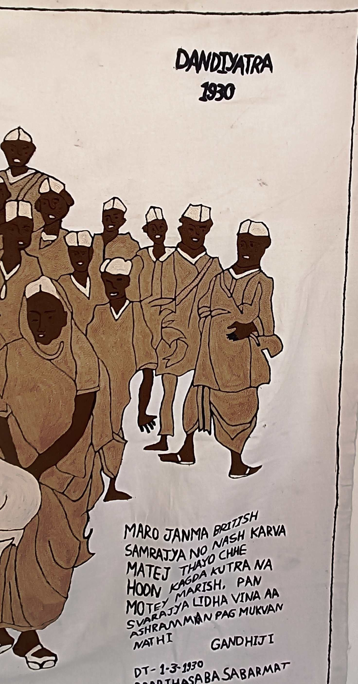 Every thread echoes the steps taken by Gandhi and his fellow satyagrahis, stitched slowly by hand to preserve a story that changed the course of a nation. The cream-colored cotton base offers both a traditional canvas and a humble nod to Gandhi’s own advocacy for natural fibers and khadi.