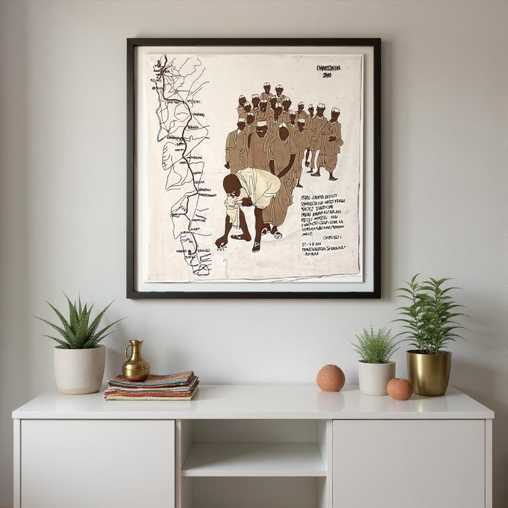 In 1930, on the quiet seashores of Dandi, Mahatma Gandhi walked with a handful of followers to protest the British monopoly on salt. That 240-mile march, known as the Salt Satyagraha, became a defining chapter in India’s non-violent struggle for independence. This handcrafted wall hanging captures that powerful moment—not with paint or print, but through the delicate and labor-intensive art of Aari embroidery.