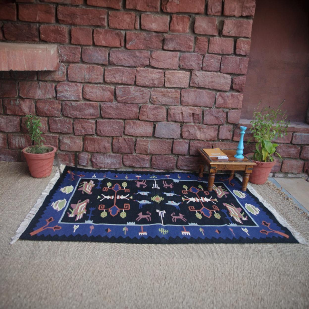 Transform your home with the timeless elegance of our Cotton Handwoven Rug, crafted meticulously by artisans from Rajasthan. Its navy blue hue and intricate patterns add a touch traditional charm to any space, whether indoors or outdoors.