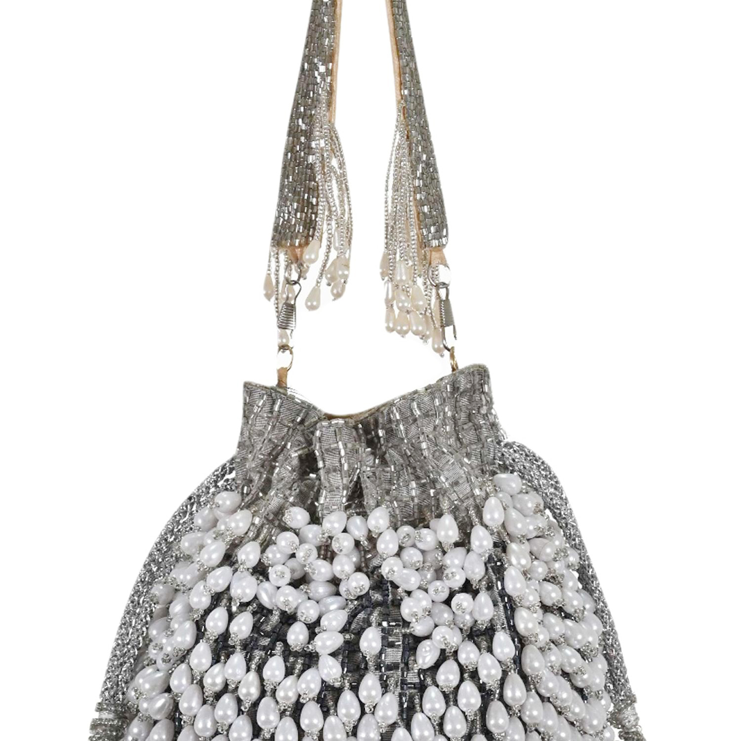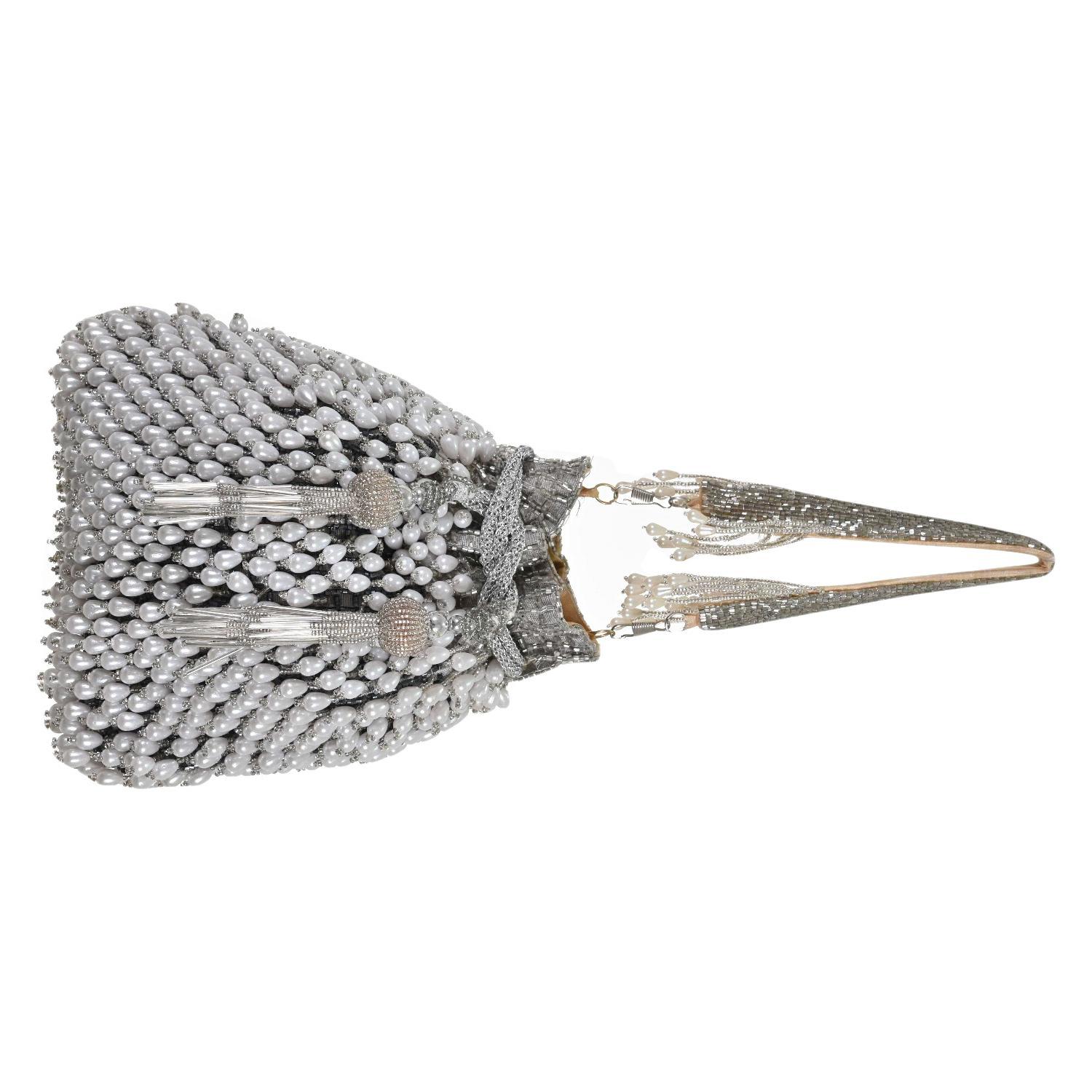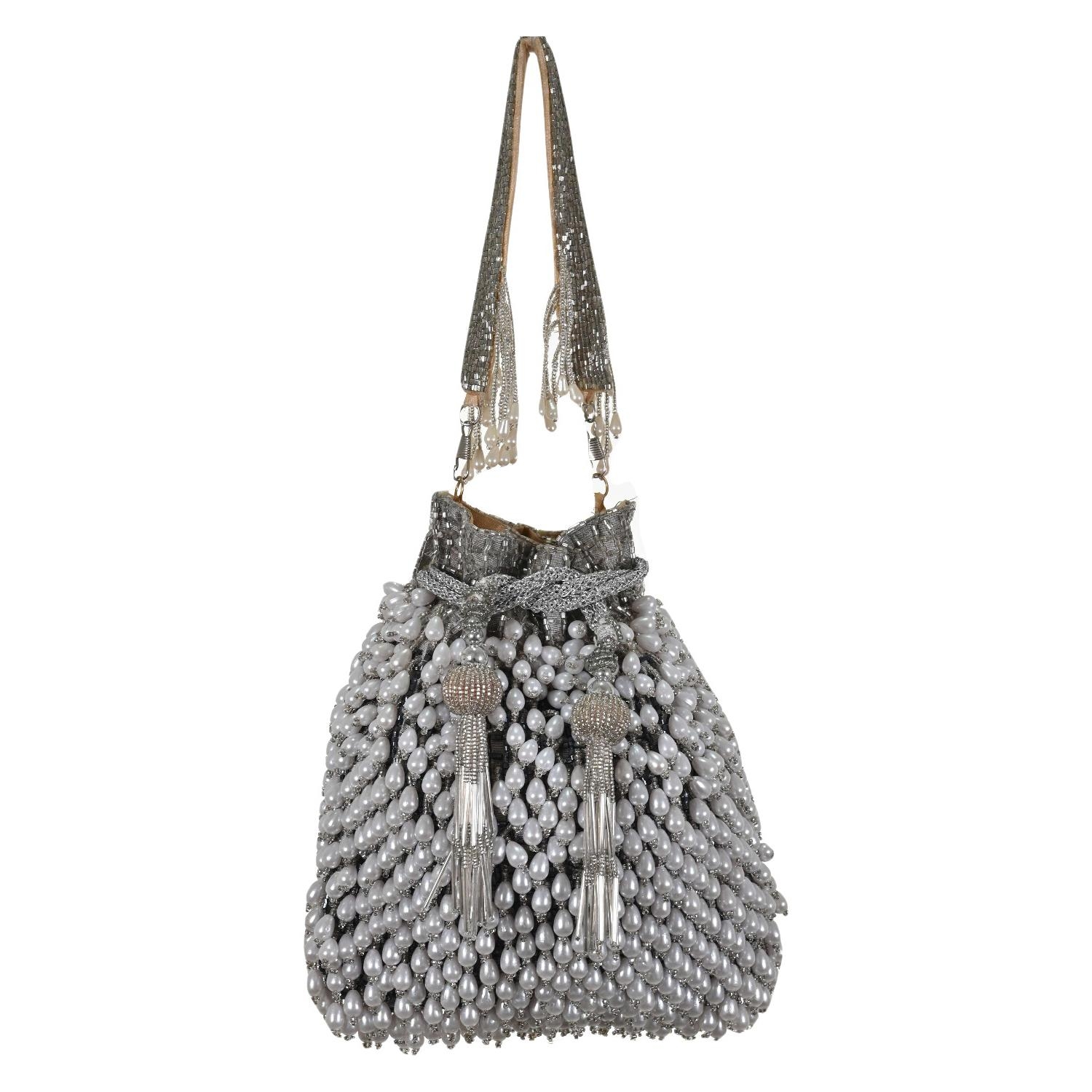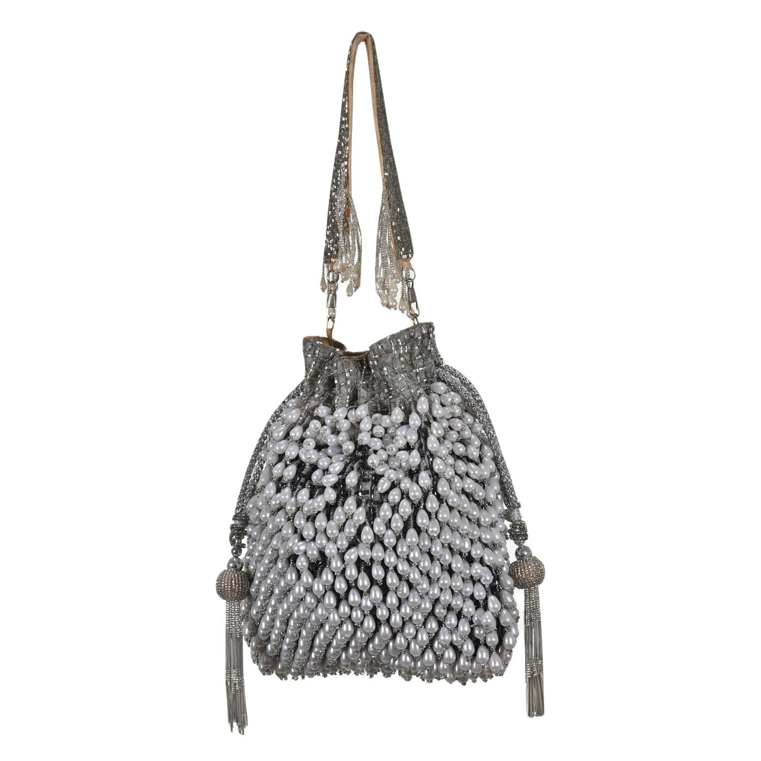Elevate your look with this Party Wear Pearls Ethnic Potli Bag. Buy it now from Indiahandmade and shine at your next special occasion!