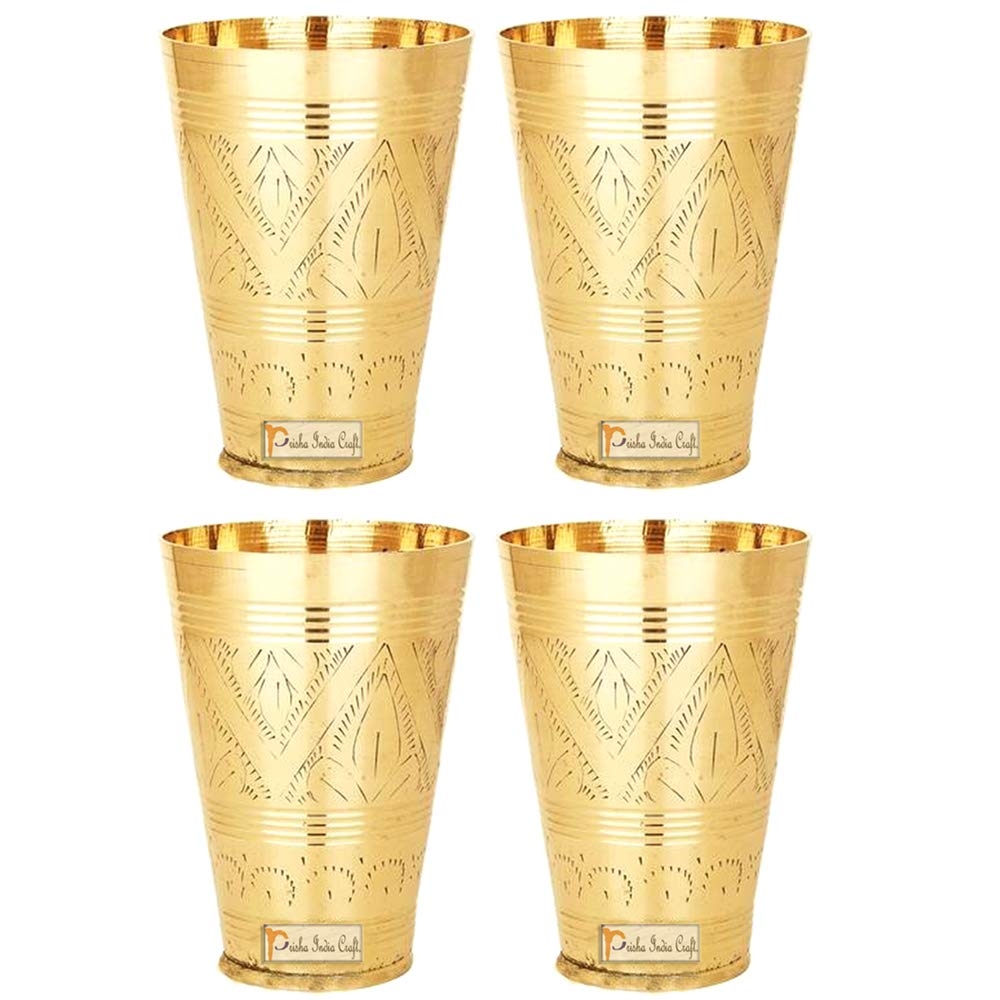 FEATURES Pure Brass Tumbler: Set of 6 Mughlai Style Embossed Design Glass, Color: Gold, Material: Brass, Weight: Aprox 1152 Gram, Height: 4.50" INCH, Width/Diameter: 3.00" INCH, Length: 3.00 INCH, Capacity: 250 ML