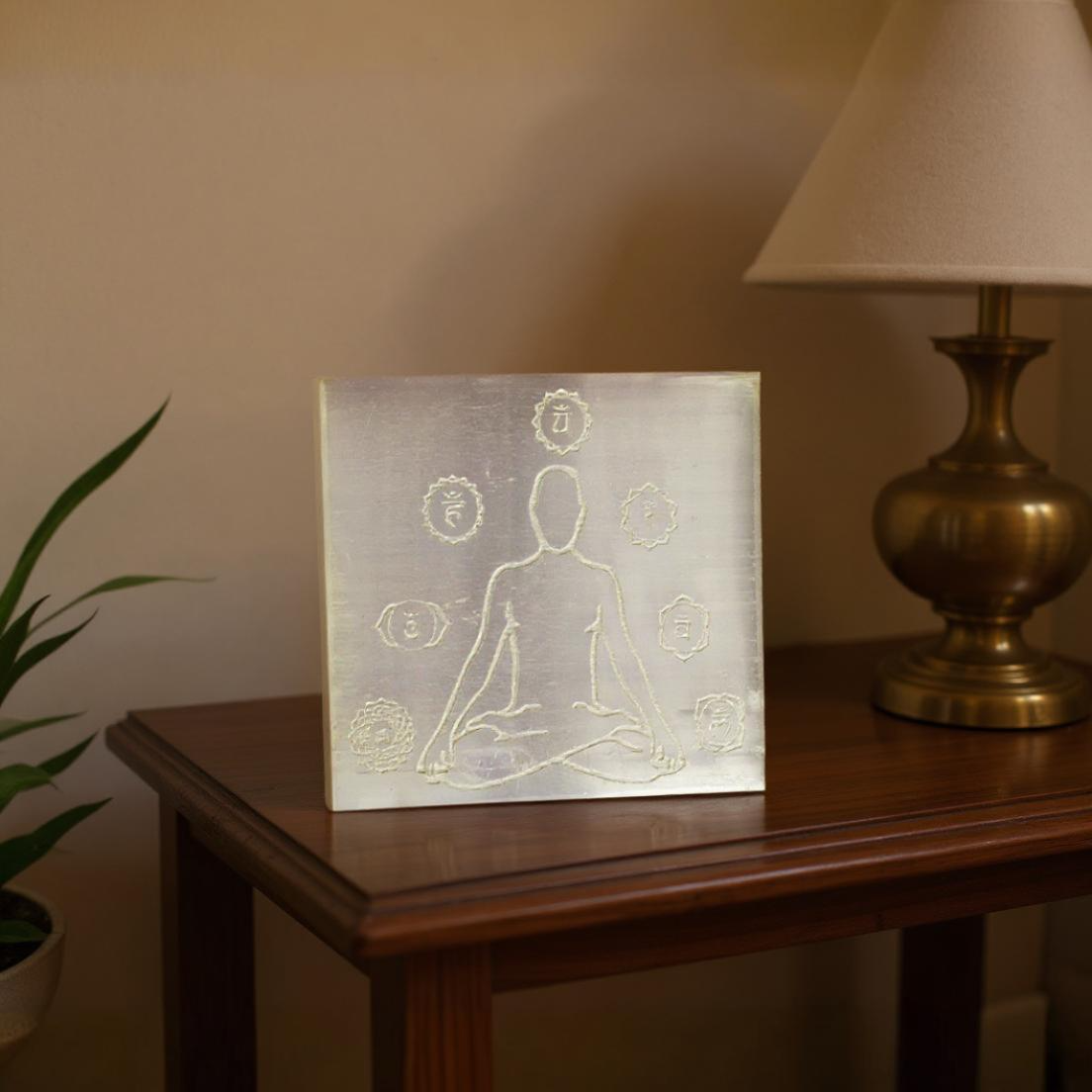 Selenite Charging Plate 7 Chakra with Yoga Symbol