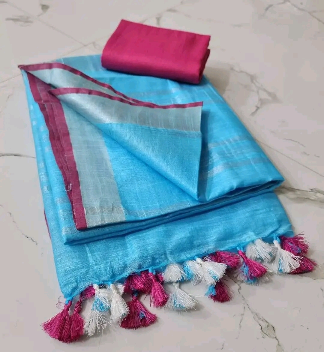 Sky Blue Linen Cotton Saree with Silver Zari Border