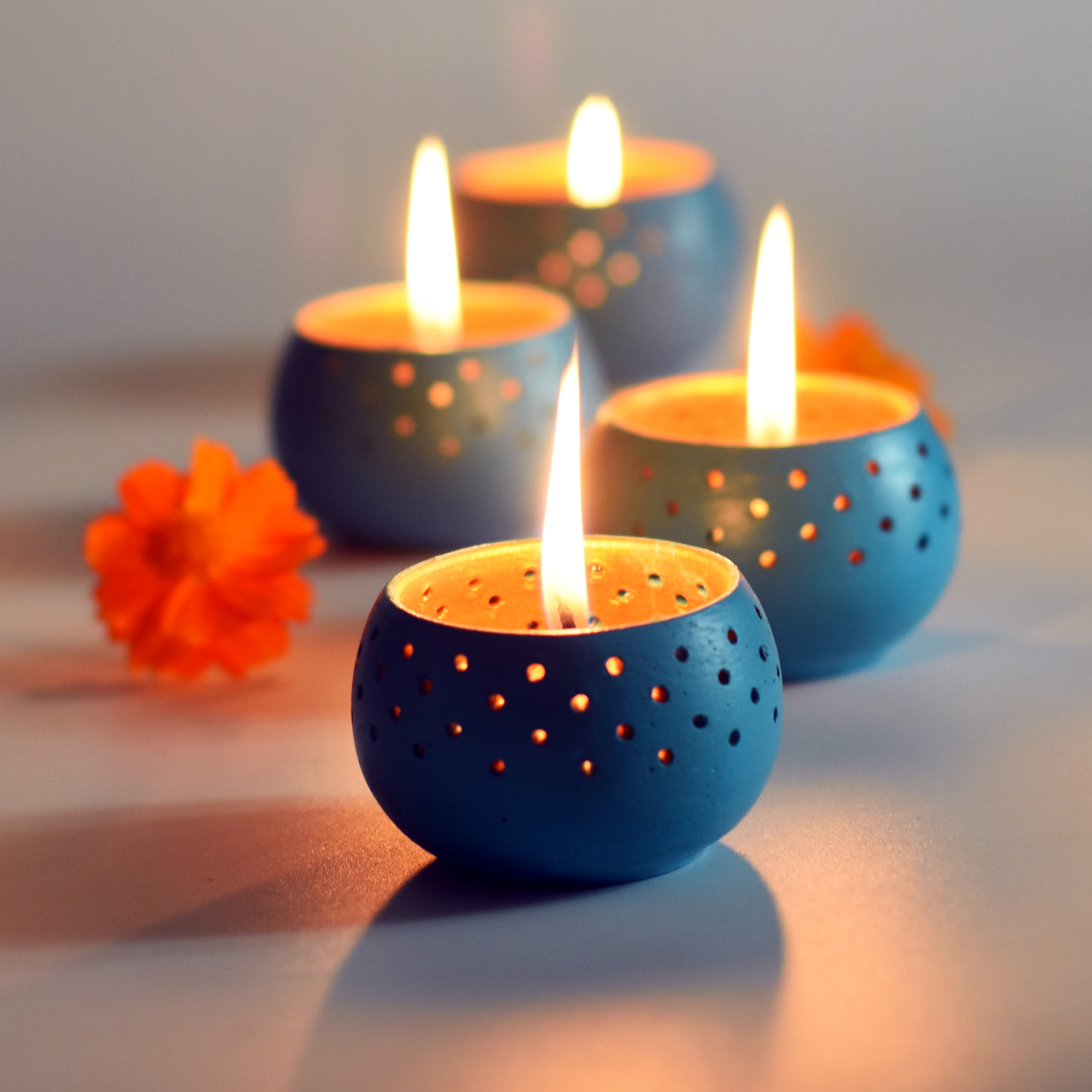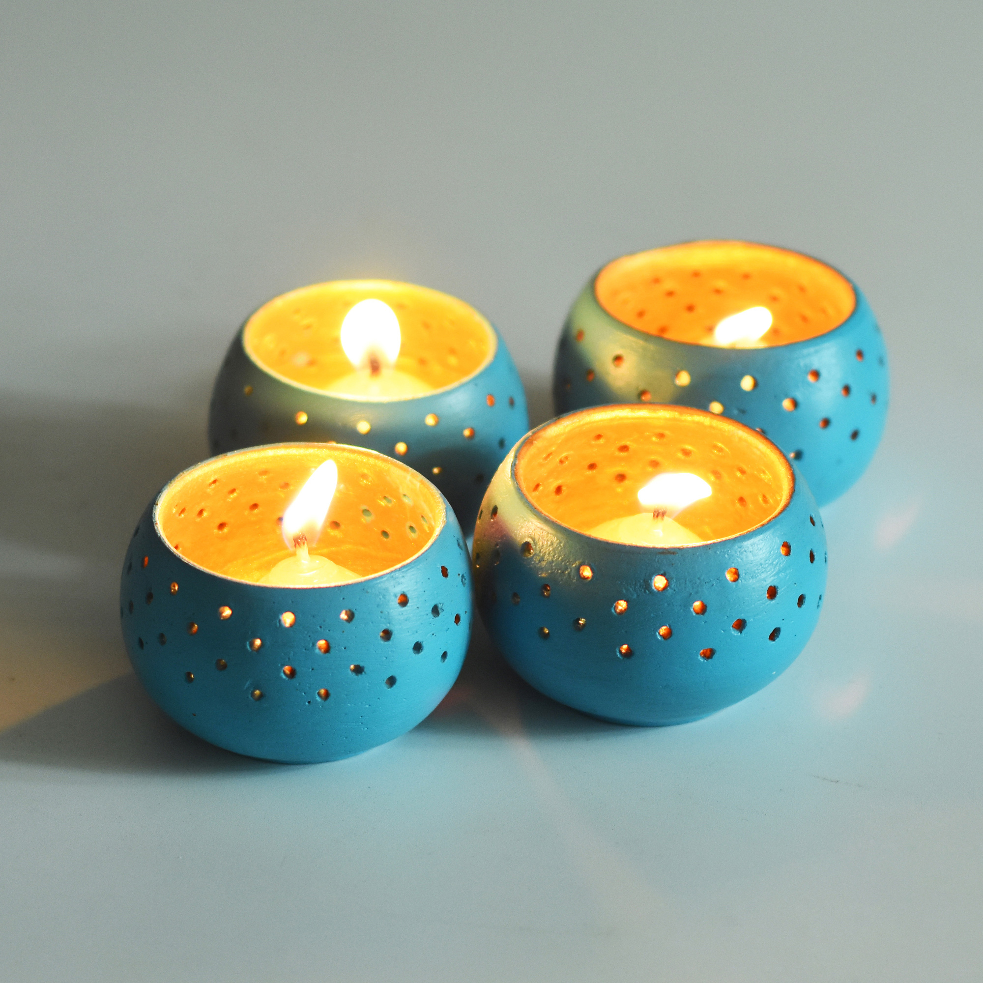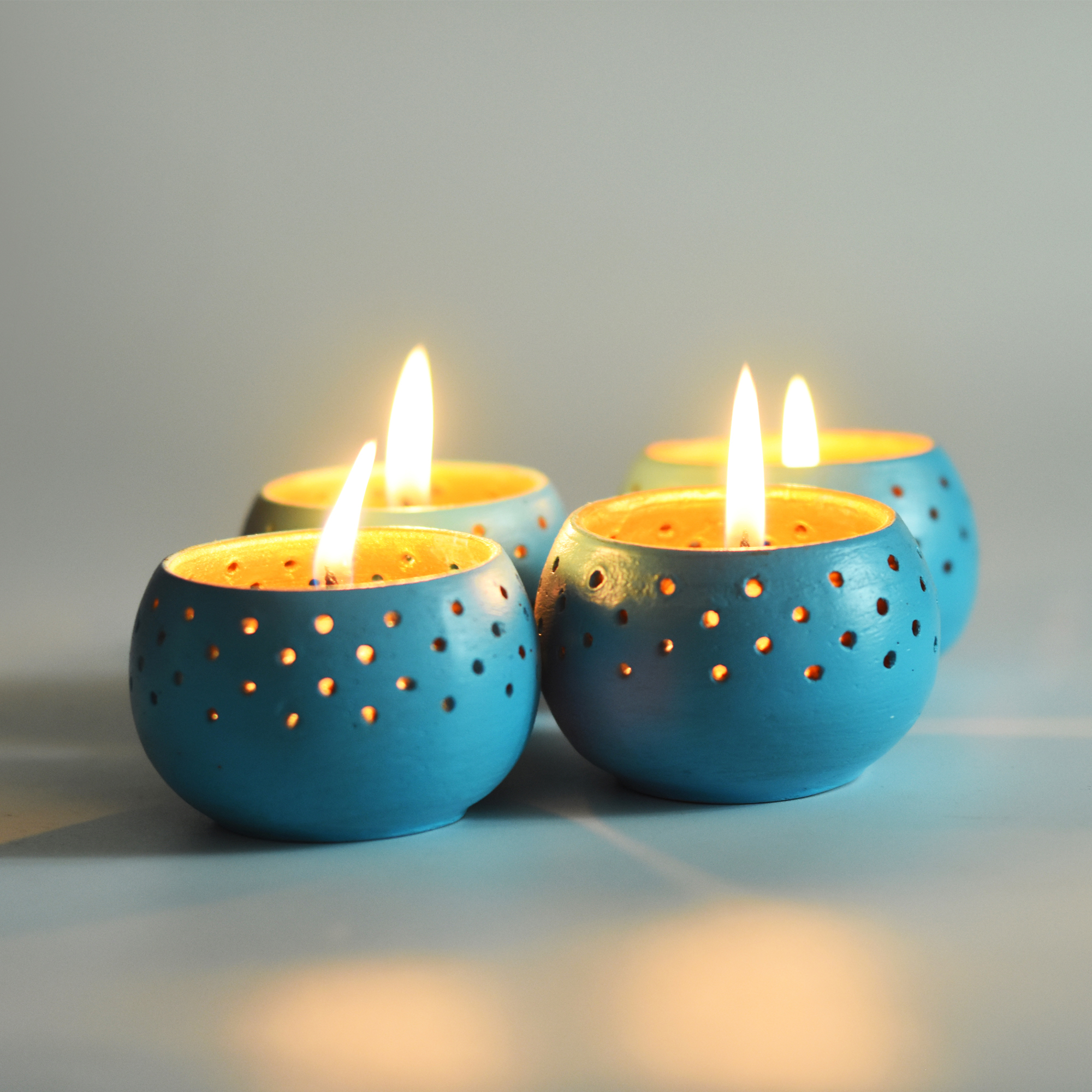 Each set includes four natural terracotta pods with a luxurious golden interior, accompanied by perfumed smokeless tealight candles. Designed to infuse your interiors with a play of natural light, these holders not only serve as functional decor but also make for a thoughtful gift that embodies the essence of handmade artistry.