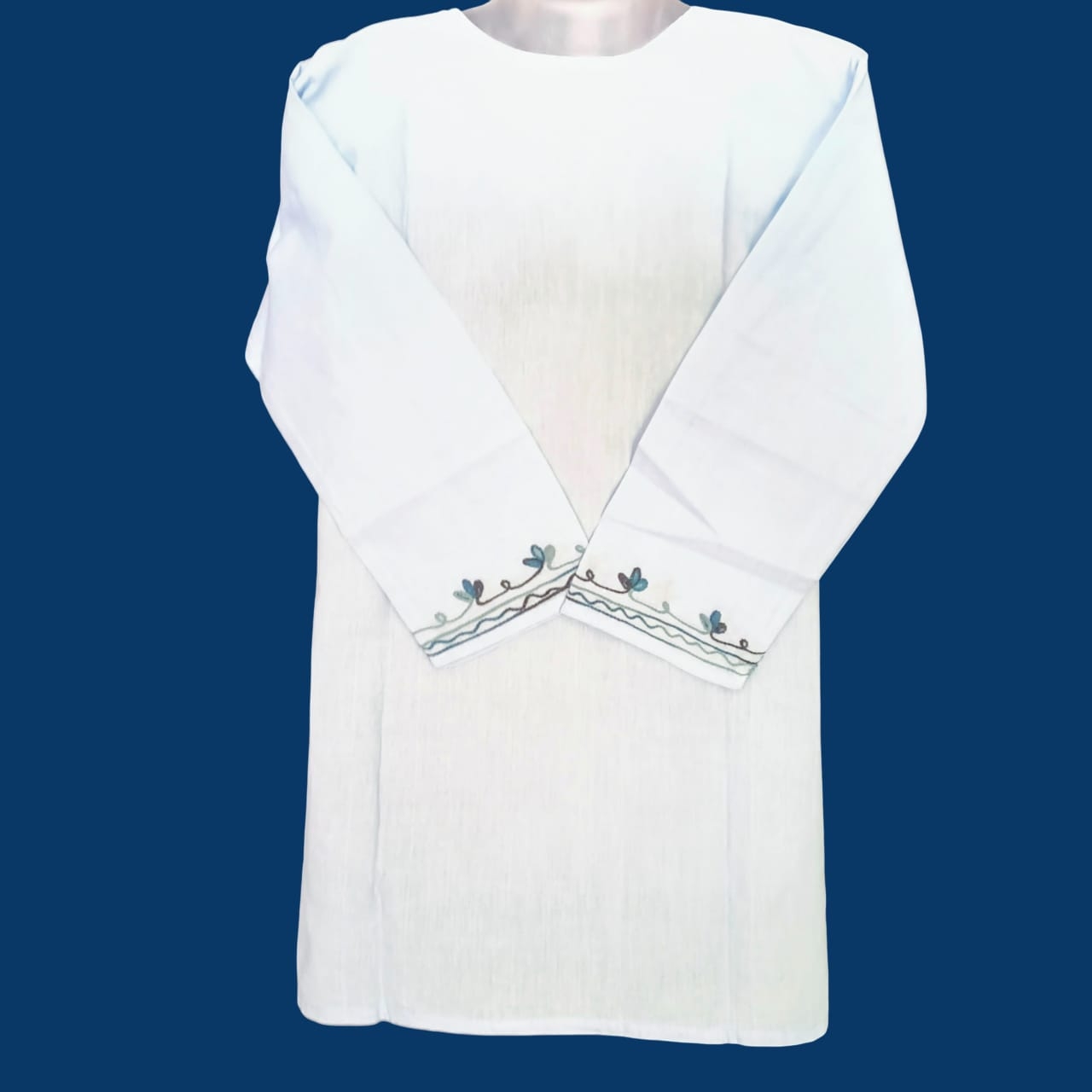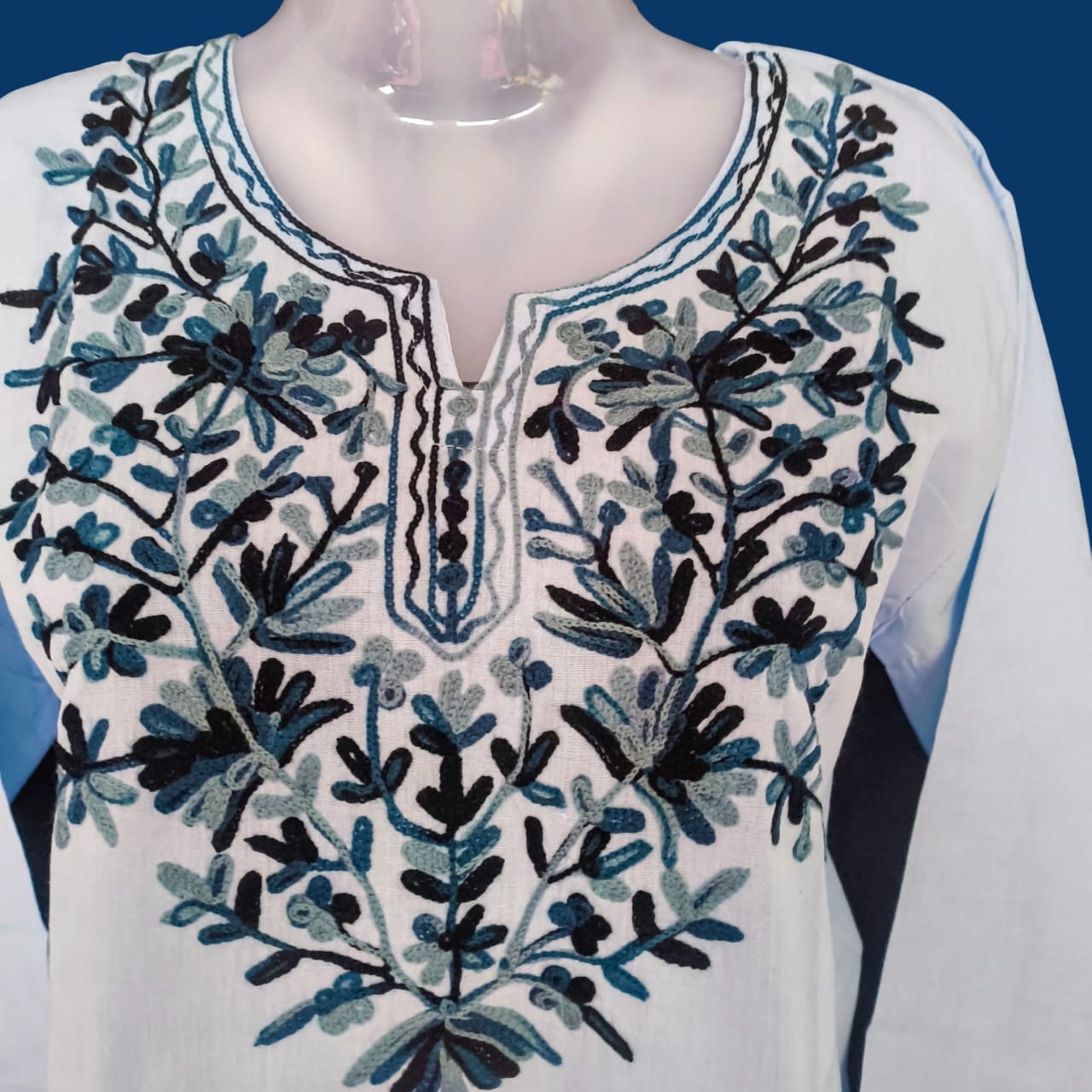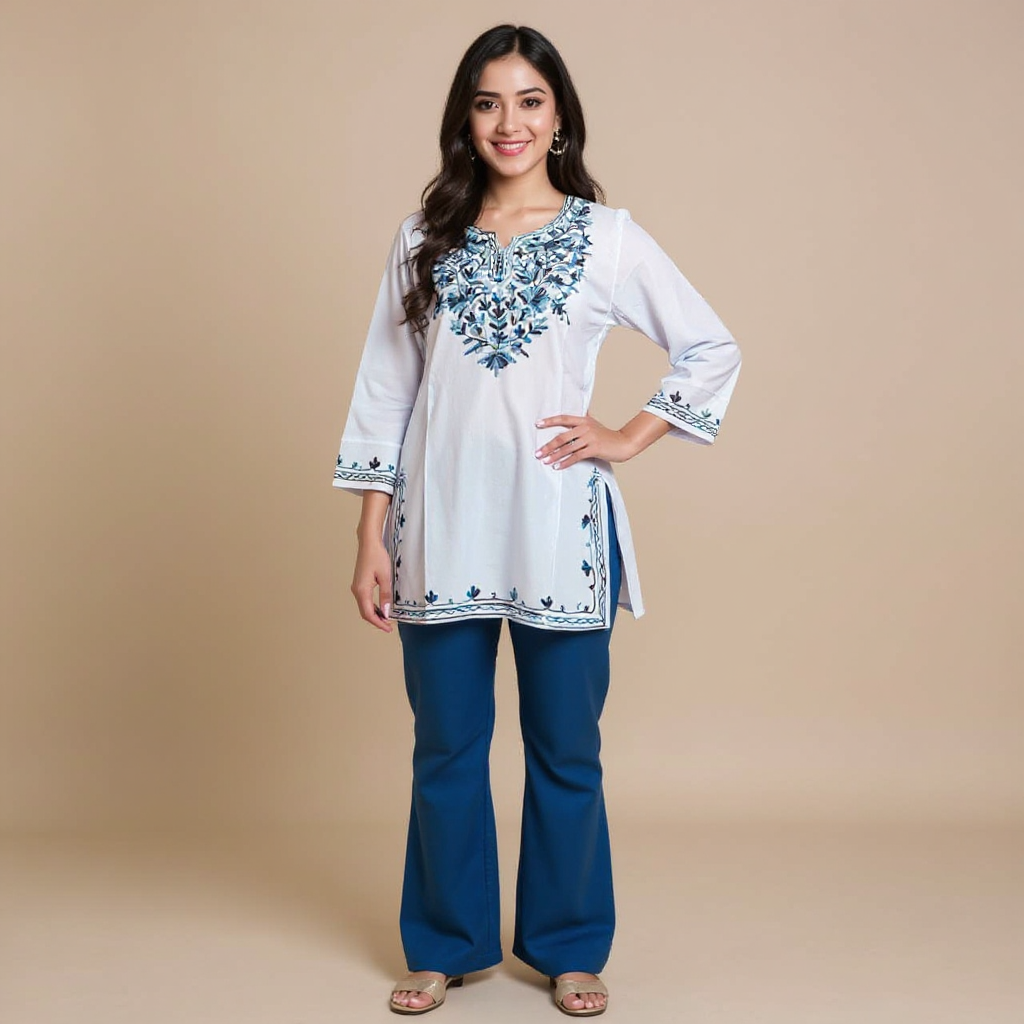 This elegant white cotton kurti features intricate blue floral embroidery on the front, sleeves, and hemline. Designed with a round neck and 3/4th sleeves, it offers a comfortable fit and a stylish ethnic look, perfect for daily wear, office wear, or casual outings.