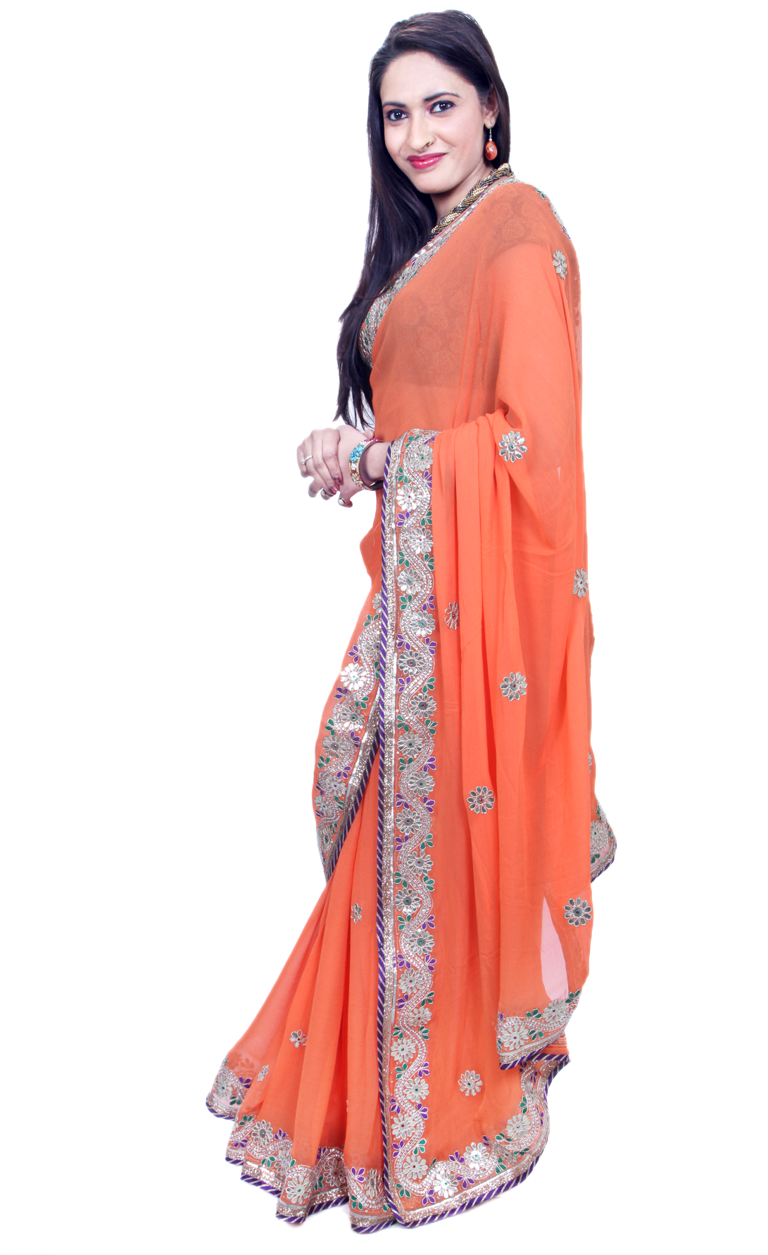 Step into a world of warmth and cheer with our stunning orange georgette saree, a beautiful symbol of liveliness and grace. Adorned with intricate gotta patti (Zari Zardogi) border work and delicate flower butti of gotta elegantly spread all over, this saree exudes timeless charm and elegance. The smooth georgette fabric drapes gracefully, ensuring comfort throughout the day. Perfect for joyous celebrations and special gatherings, this saree is sure to captivate hearts and make you stand out. Embrace the richness of the orange color and the intricate craftsmanship in this masterpiece, designed to enhance your style and make you look and feel fabulous. Embrace the blend of tradition and contemporary allure with our enchanting orange georgette saree.