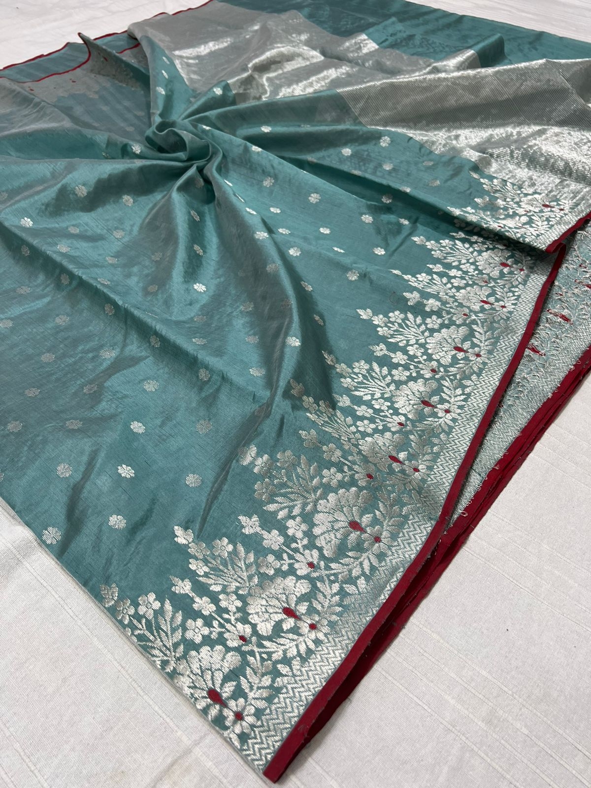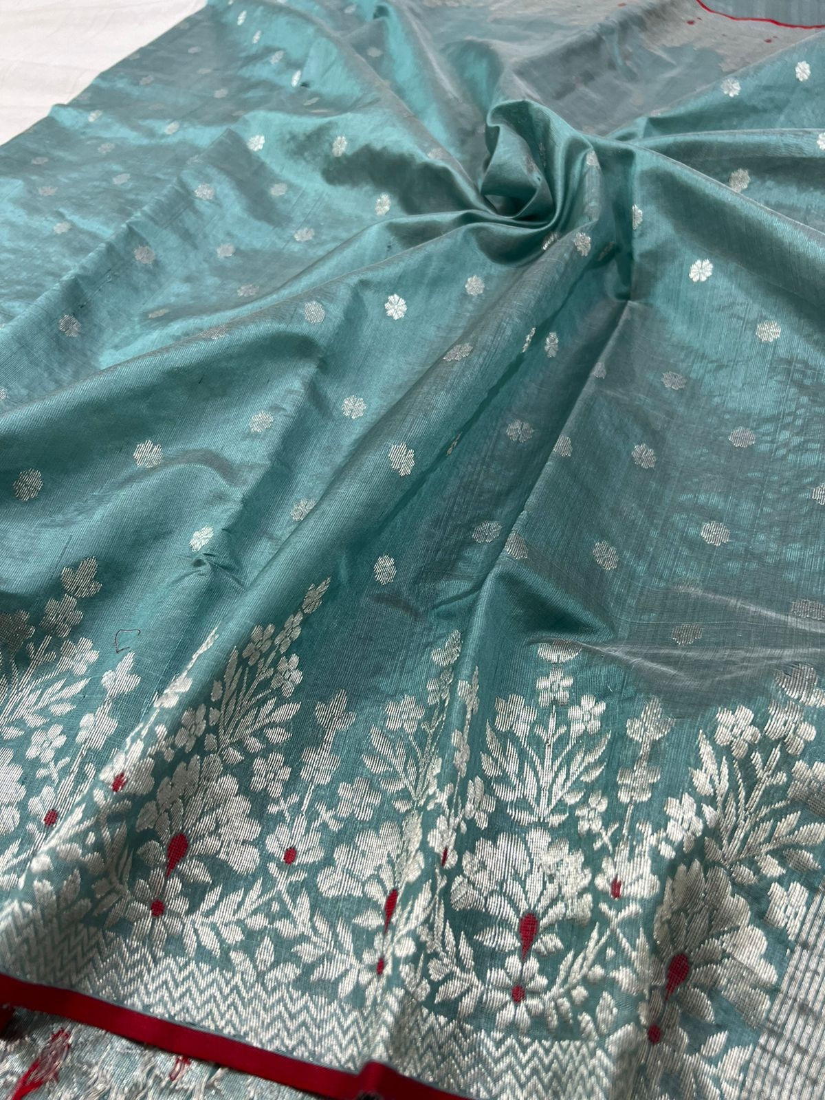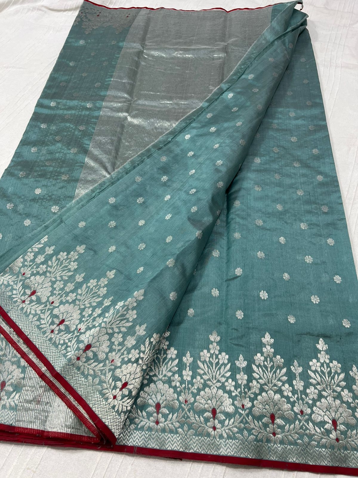 chanderi handloom pattu silk silver jari wark ghani buti mina hand border saree available