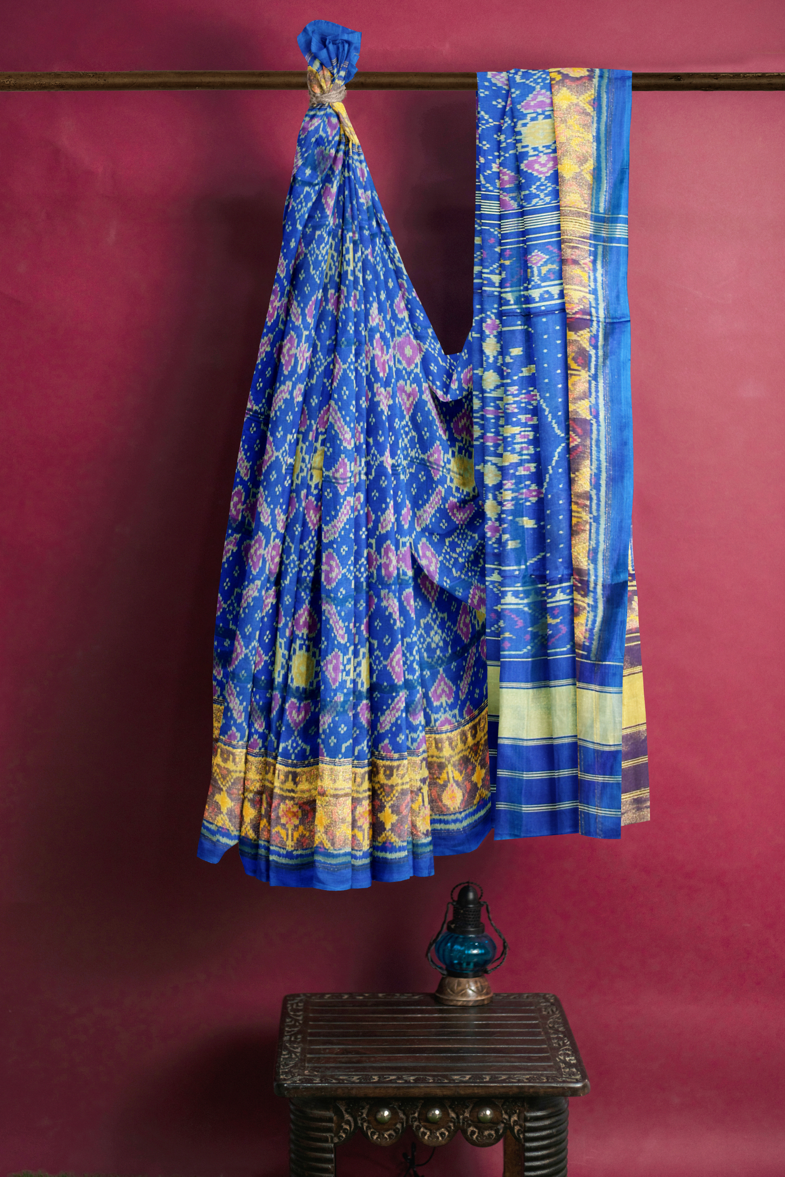 Single ikkat Patola silk saree Royal Blue mulberry silk handwoven saree from master weavers of Gujarat. Traditional ‘Manekchowk’ patterns are woven for this saree in shimmering dual shaded silk. The saree borders are highlighted with tissue zari interwoven as broad stripes. Showcasing magnificent design and crafted in pure silk features handwoven patola saree. Pair this saree with a beautiful blouse which will make you look elegant. It is handcrafted in pure Mulberry silk for utmost comfort and style.