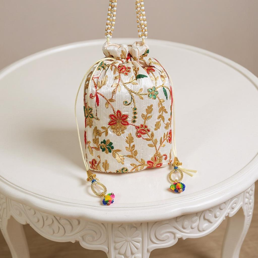 - Step into the realm of Indian craftsmanship! Visit Indiahandmade to make the Potli Bag with Zari & Embroidery Work yours. Embrace the rich tradition and artistry of Delhi's craftsmen, and make a style statement that blends tradition with contemporary flair. Elevate your accessory game and carry a piece of culture wherever you go!