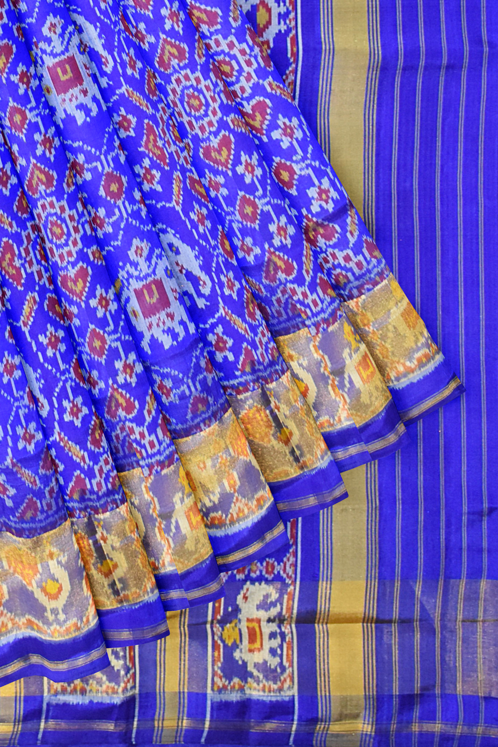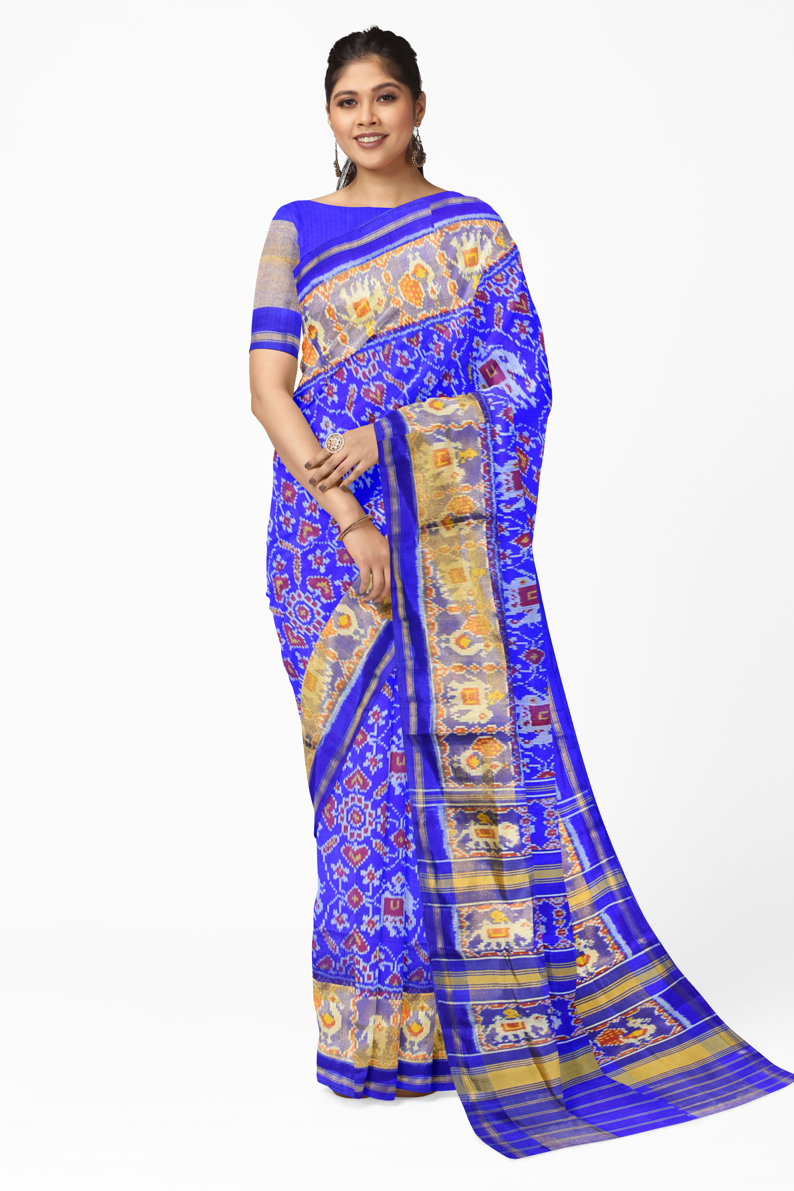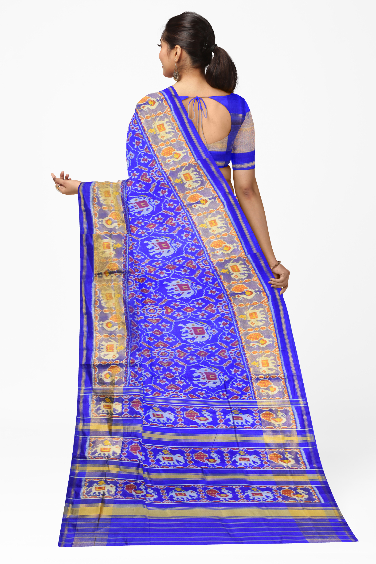 Single ikkat Patola silk saree Blue mulberry silk handwoven saree from master weavers of Gujarat. Traditional ‘Elephant Manek Chowk’ patterns are woven for this saree in shimmering dual shaded silk. The saree borders are highlighted with small zari interwoven as broad stripes. Showcasing magnificent design and crafted in pure silk features handwoven patola saree. Pair this saree with a beautiful blouse which will make you look elegant. It is handcrafted in pure Mulberry silk for utmost comfort and style.