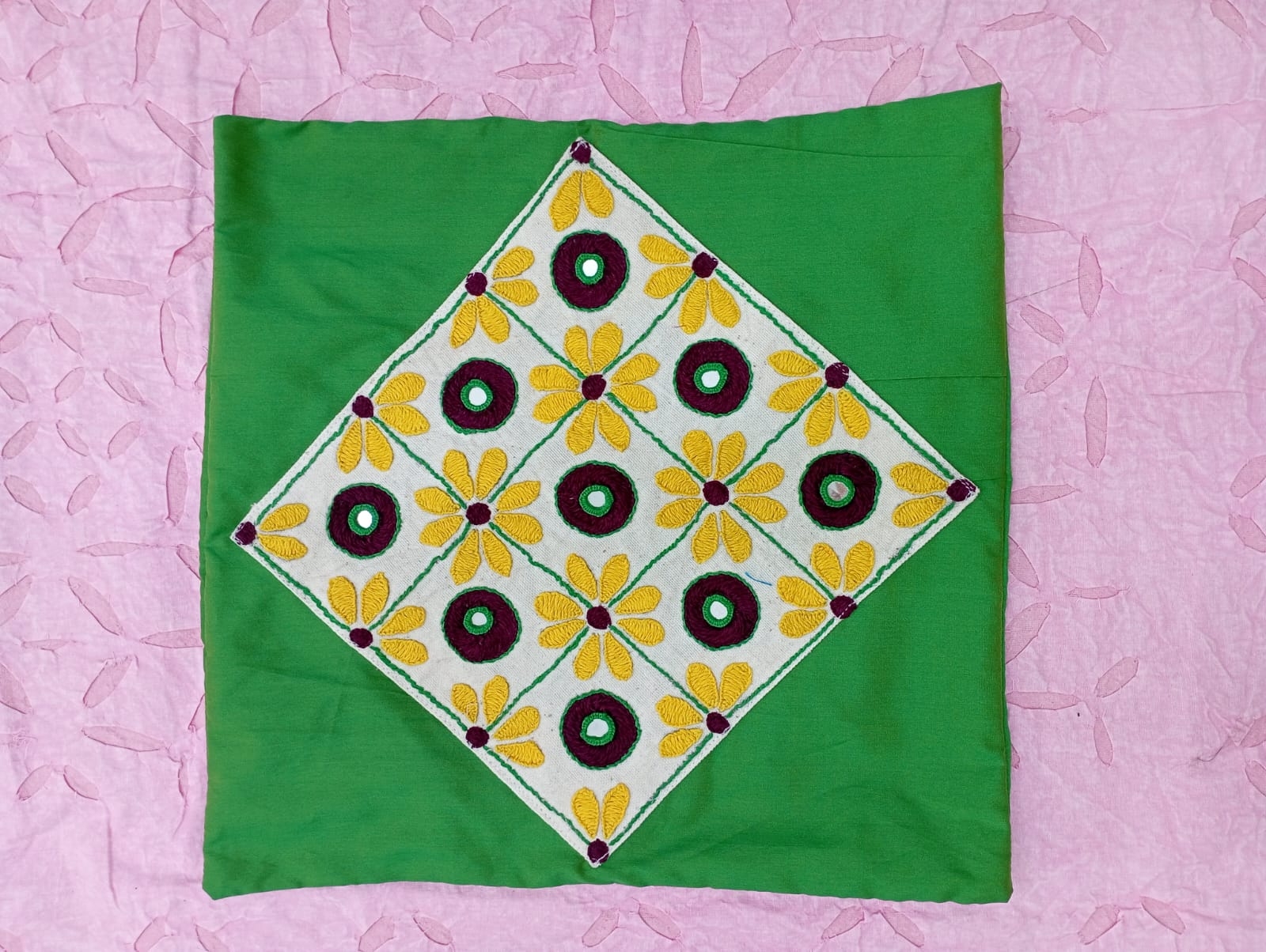 Elevate your living space with the exquisite charm of our handcrafted Embroidery and Mirror Work Cushion Cover. Made from luxurious green silk fabric, this stunning piece features intricate embroidery and sparkling mirror work, adding a touch of regal elegance to any room.
