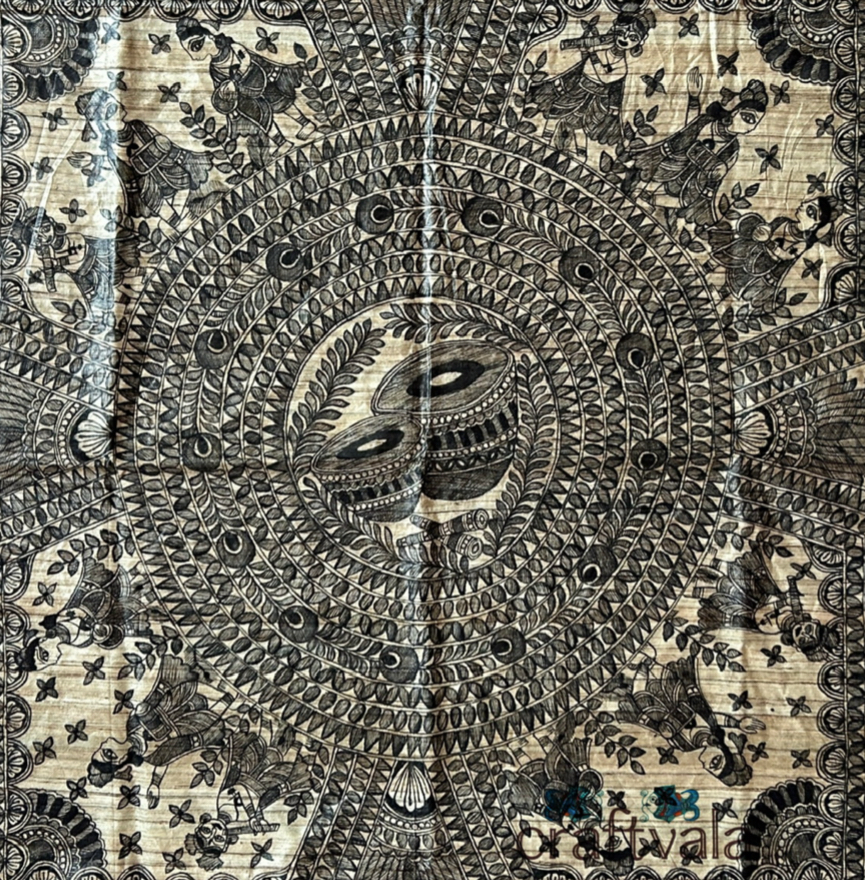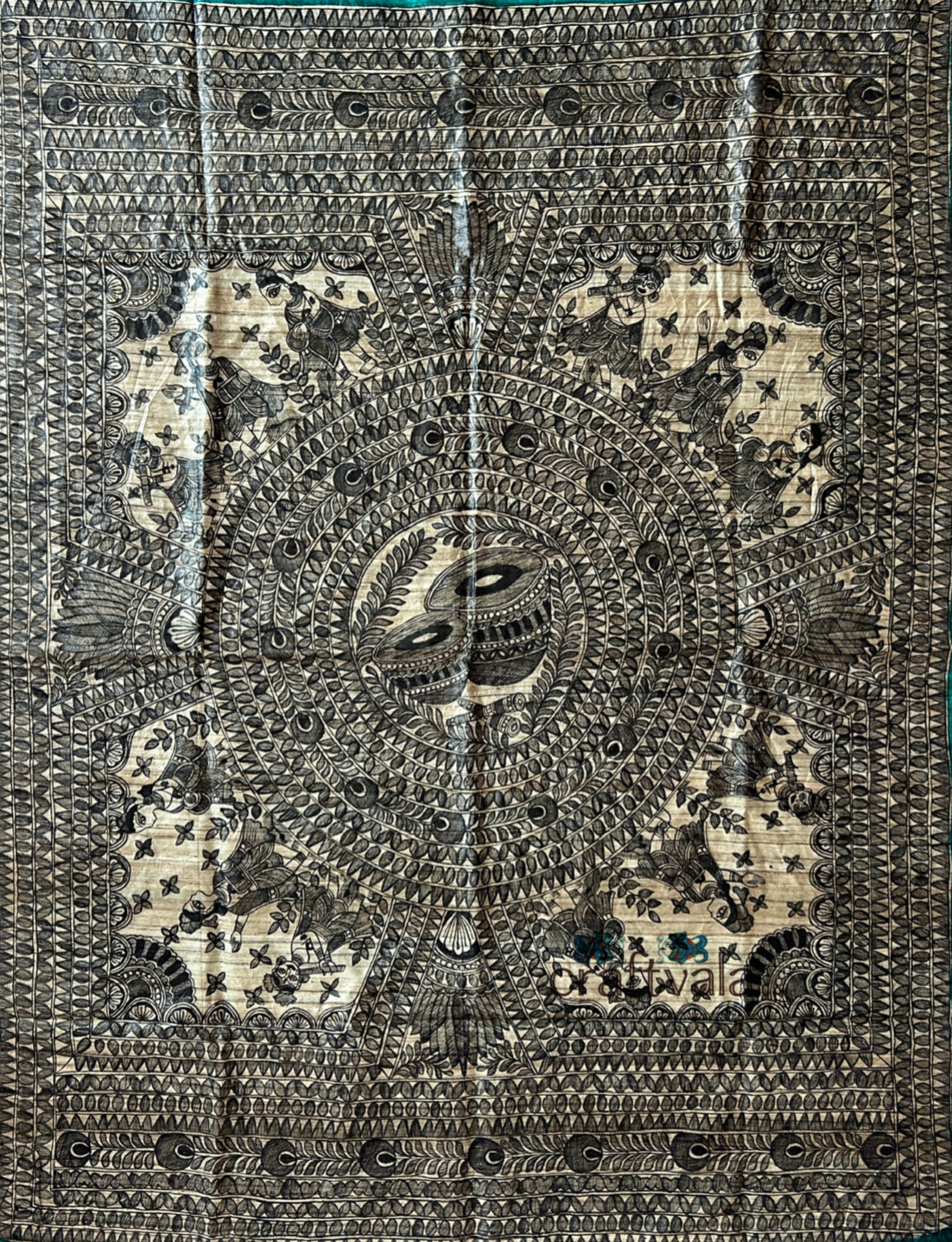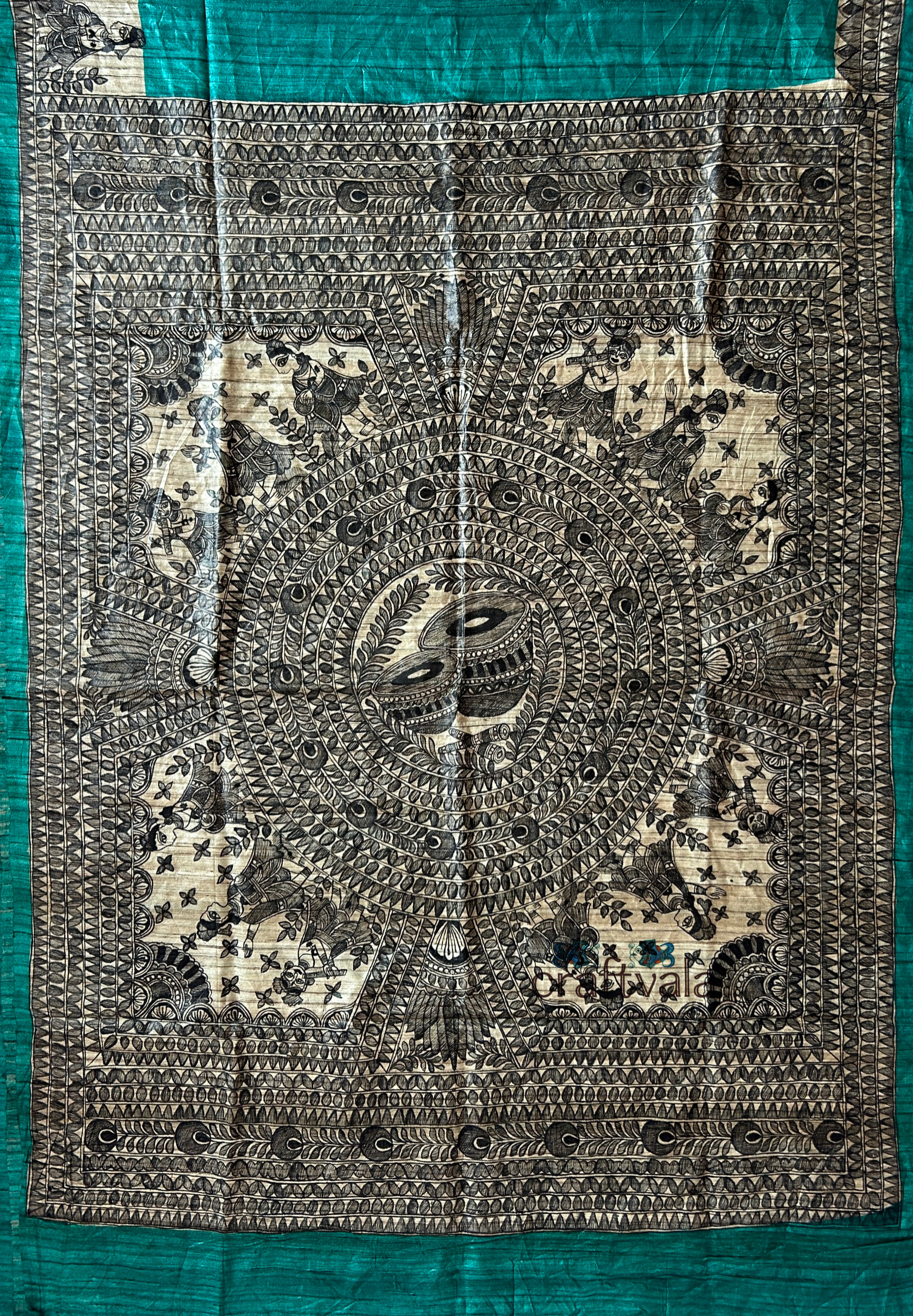 Handwoven Madhubani Tasar Ghicha Silk Saree With Hand-Painted Taraditional Madhubani Painting.